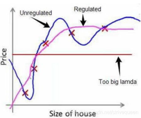 其中 λ \lambda λ又称为正则化参数(Regularization Parameter)。 注:根据惯例,我们不对 θ 0 \theta_{0} θ0进行惩罚。经过正则化处理的模型与原模型的可能对比如下图所示: