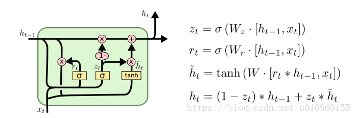 当cell为GRU时,state就只有一个了,原因是GRU将Ct 和 ht进行了简化,将其合并成了ht,如下图所示,GRU将遗忘门和输入门合并成了更新门,另外cell不在有细胞状态cell state,只有hidden state。