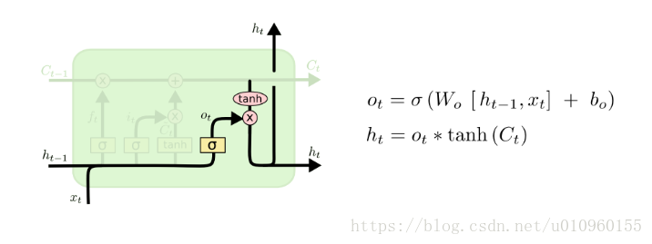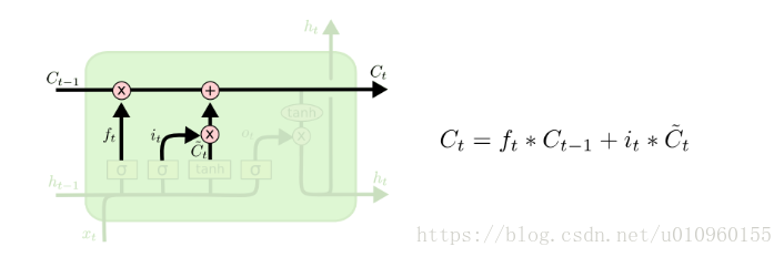 我们以LSTM和GRU分别为tf.nn.dynamic_rnn的输入cell类型为例,当cell为LSTM,state形状为[2,batch_size, cell.output_size ];当cell为GRU时,state形状为[batch_size, cell.output_size ]。其原因是因为LSTM和GRU的结构本身不同,如下面两个图所示,这是LSTM的cell结构,每个cell会有两个输出:Ct 和 ht,上面这个图是输出Ct,代表哪些信息应该被记住哪些应该被遗忘; 下面这个图是输出ht,代表这个cell的最终输出,LSTM的state是由Ct 和 ht组成的。