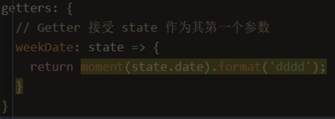 getters: {// 返回一个函数,就可以传参了weekDate: (state) => (fm) => {return moment(state.date).format(fm ?fm :'dddd');}}