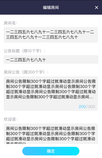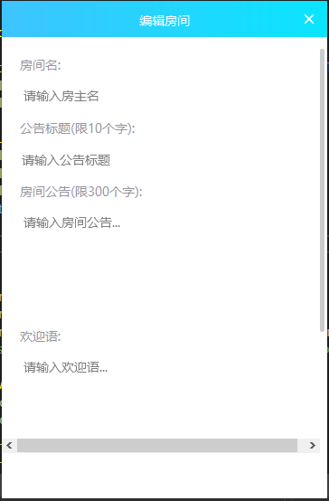 {scrollArea = new QScrollArea(this);scrollArea->setGeometry(0, 50, 360, 450);/*左上长宽*/QFrame * widget = new QFrame(this);widget->setContentsMargins(0, 0, 0, 0);widget->setFixedSize(350, 590);m_pTrunk = new QVBoxLayout(widget);m_pTrunk->setContentsMargins(15, 0, 20, 10);m_pTrunk->setSpacing(10);QLabel *roomName = new QLabel;roomName->setText(u8"房间名:");roomName->setObjectName("editroom_topic");QTextEdit *roomNameEdit = new QTextEdit;roomNameEdit->setFixedWidth(331);roomNameEdit->setFixedHeight(54);roomNameEdit->setPlaceholderText(QStringLiteral("请输入房间名"));roomNameEdit->setObjectName("grey_4r_textedit");QLabel *roomNoticeTitle = new QLabel;roomNoticeTitle->setText(u8"公告标题(限10个字):");roomNoticeTitle->setObjectName("editroom_topic");m_pNoticeTitleRegister = new QLabel(); //计数器m_pNoticeTitleRegister->setGeometry(100, 250, 58, 18);m_pNoticeTitleRegister->setStyleSheet("QLabel{color:#95949D;font:14px;}");roomNoticeTitleEdit = new QLineEdit;roomNoticeTitleEdit->setFixedWidth(250);roomNoticeTitleEdit->setFixedHeight(30);roomNoticeTitleEdit->setPlaceholderText(QStringLiteral("请输入公告标题"));roomNoticeTitleEdit->setObjectName("grey_4r_lineedit_register");roomNoticeTitleEdit->setMaxLength(10);connect(roomNoticeTitleEdit, SIGNAL(textEdited()), this, SLOT(slot_scalerNoticeTitleText()));QLabel *roomNotice = new QLabel;roomNotice->setText(u8"房间公告(限300个字):");roomNotice->setObjectName("editroom_topic");m_pNoticeRegister = new QLabel(); //计数器m_pNoticeRegister->setGeometry(100, 450, 58, 18);m_pNoticeRegister->setStyleSheet("QLabel{color:#95949D;font:14px;}");roomNoticeEdit = new QTextEdit;roomNoticeEdit->setFixedWidth(314);roomNoticeEdit->setFixedHeight(110);roomNoticeEdit->setPlaceholderText(QStringLiteral("请输入房间公告..."));roomNoticeEdit->setObjectName("grey_4r_textedit_Register");roomNoticeEdit->setMaximumWidth(10);connect(roomNoticeEdit, SIGNAL(textChanged()), this, SLOT(slot_scalerNoticeText()));QLabel *roomWelcome = new QLabel;roomWelcome->setText(u8"欢迎语(限300个字):");roomWelcome->setObjectName("editroom_topic");m_pWelcomeRegister = new QLabel(); //计数器m_pWelcomeRegister->setGeometry(100, 650, 58, 18);m_pWelcomeRegister->setStyleSheet("QLabel{color:#95949D;font:14px;}");roomWelcomeEdit = new QTextEdit;roomWelcomeEdit->setFixedWidth(314);roomWelcomeEdit->setFixedHeight(110);roomWelcomeEdit->setPlaceholderText(QStringLiteral("请输入欢迎语..."));//roomWelcomeEdit->setHtml(QString("<font color=\"#95949D\">%1</font>").arg(QStringLiteral(" 请输入欢迎语...")));roomWelcomeEdit->setObjectName("grey_4r_textedit_Register");connect(roomWelcomeEdit, SIGNAL(textChanged()), this, SLOT(slot_scalerWelcomeText()));QLabel *roomKey = new QLabel;roomKey->setText(u8"房间密码:");roomKey->setObjectName("editroom_topic");QLineEdit *roomKeyEdit = new QLineEdit;roomKeyEdit->setFixedWidth(331);roomKeyEdit->setFixedHeight(30);roomKeyEdit->setPlaceholderText(QStringLiteral("请输入4位房间密码..."));roomKeyEdit->setObjectName("grey_4r_lineedit");QRegExp regx("[0-9]+$");QValidator *validator = new QRegExpValidator(regx, roomKeyEdit);roomKeyEdit->setValidator(validator);roomKeyEdit->setMaxLength(4);/*结合计数器和edit*/QWidget *m_pNoticeTitleBar = new QWidget;m_pNoticeTitleBar->setContentsMargins(0, 0, 0, 0);m_pNoticeTitleBar->setFixedWidth(330);m_pNoticeTitleBar->setFixedHeight(30);m_pNoticeTitleBar->setObjectName("edit_Register_bar");QVBoxLayout *m_pNoticeTitleBox = new QVBoxLayout(m_pNoticeTitleBar);m_pNoticeTitleBox->addWidget(roomNoticeTitleEdit, 0, Qt::AlignLeft);QWidget *m_pNoticeBar = new QWidget;m_pNoticeBar->setFixedHeight(120);m_pNoticeBar->setFixedWidth(330);m_pNoticeBar->setObjectName("edit_Register_bar");QVBoxLayout *m_pNoticeBox = new QVBoxLayout(m_pNoticeBar);m_pNoticeBox->addWidget(roomNoticeEdit, 0, Qt::AlignTop | Qt::AlignLeft);m_pNoticeBox->addWidget(m_pNoticeRegister, 0, Qt::AlignTrailing | Qt::AlignRight);m_pNoticeBox->addSpacing(2);QWidget *m_pWelcomeBar = new QWidget;m_pWelcomeBar->setFixedHeight(120);m_pWelcomeBar->setFixedWidth(330);m_pWelcomeBar->setObjectName("edit_Register_bar");QVBoxLayout *m_pNoticeWelcomeBox = new QVBoxLayout(m_pWelcomeBar);m_pNoticeWelcomeBox->addSpacing(-6);m_pNoticeWelcomeBox->addWidget(roomWelcomeEdit, 0, Qt::AlignTop | Qt::AlignLeft);m_pNoticeWelcomeBox->addWidget(m_pWelcomeRegister, 0, Qt::AlignTrailing | Qt::AlignRight);m_pNoticeWelcomeBox->addSpacing(2);m_pTrunk->addWidget(roomName, 0, Qt::AlignLeft);m_pTrunk->addWidget(roomNameEdit, 0, Qt::AlignLeft);m_pTrunk->addWidget(roomNoticeTitle, 0, Qt::AlignLeft);m_pTrunk->addWidget(m_pNoticeTitleBar, 0, Qt::AlignLeft);m_pTrunk->addWidget(roomNotice, 0, Qt::AlignLeft);m_pTrunk->addWidget(m_pNoticeBar, 0, Qt::AlignLeft);m_pTrunk->addWidget(roomWelcome, 0, Qt::AlignLeft);m_pTrunk->addWidget(m_pWelcomeBar, 0, Qt::AlignLeft);m_pTrunk->addWidget(roomKey, 0, Qt::AlignLeft);m_pTrunk->addWidget(roomKeyEdit, 0, Qt::AlignLeft);widget->setLayout(m_pTrunk);scrollArea->setWidget(widget);widget->setObjectName("we");widget->setStyleSheet("QFrame#we{background:white;}");