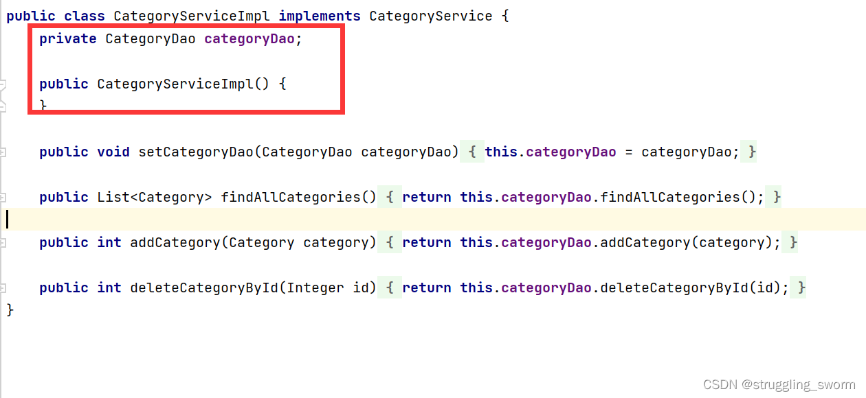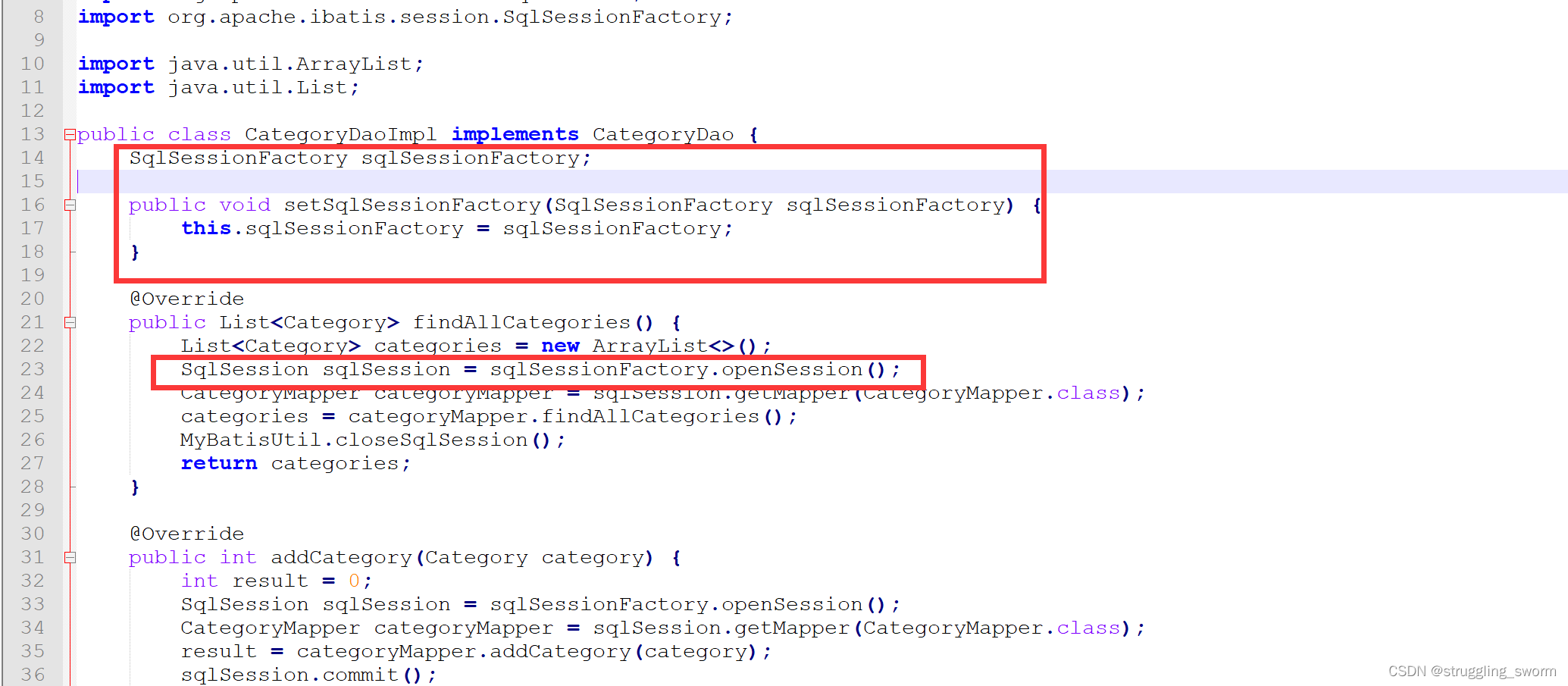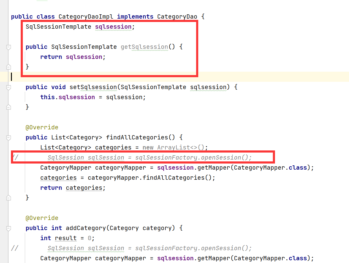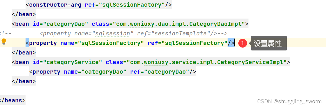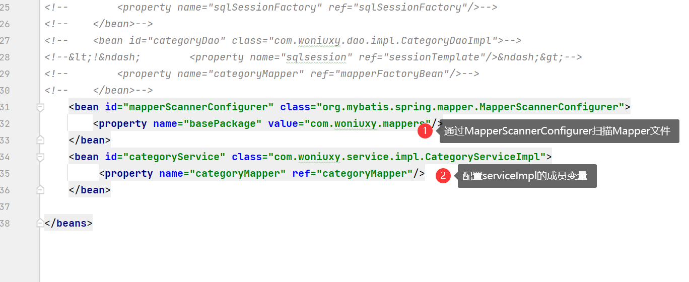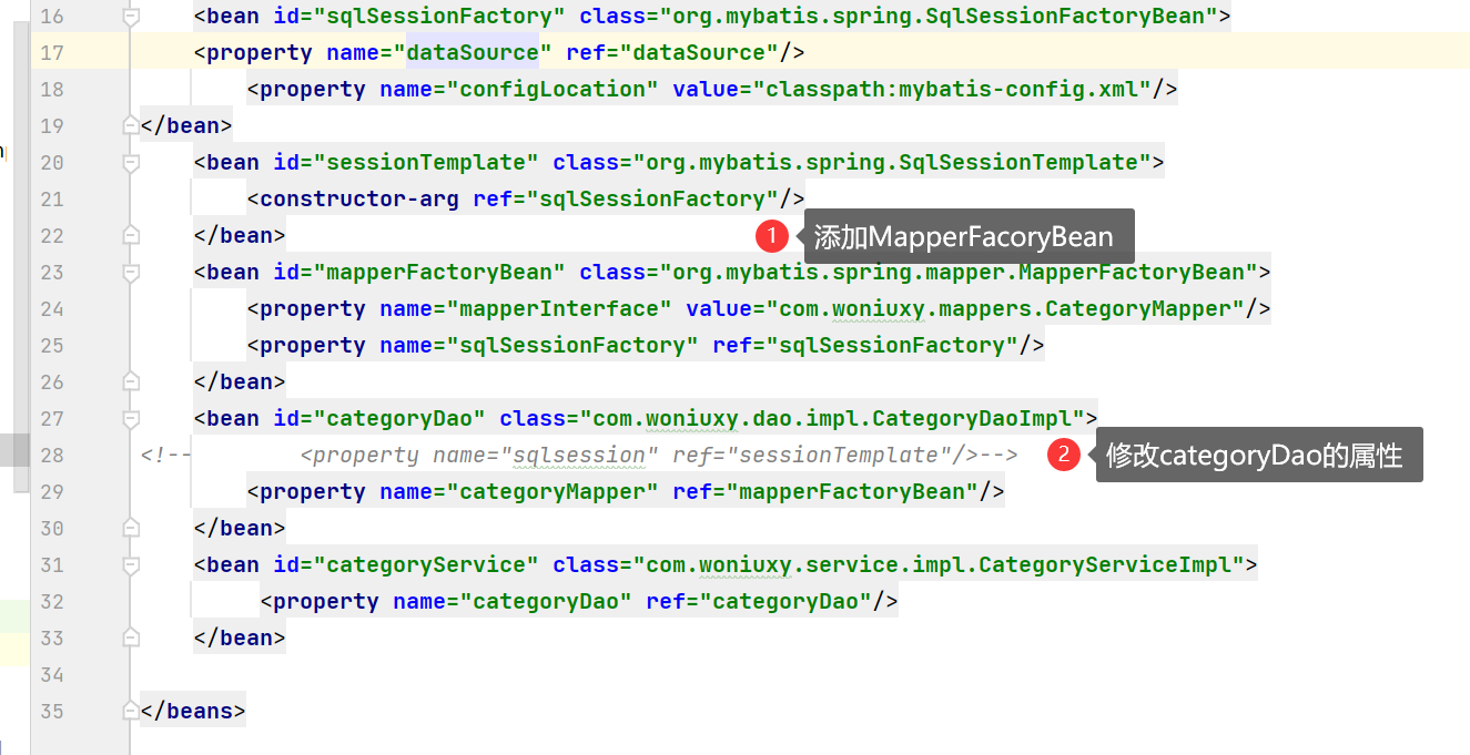 </bean><bean id="categoryDao" class="com.woniuxy.dao.impl.CategoryDaoImpl"><property name="sqlsessionFactory" ref="sqlSessionFactory"/></bean><bean id="categoryService" class="com.woniuxy.service.impl.CategoryServiceImpl"><property name="categoryDao" ref="categoryDao"/></bean></beans>