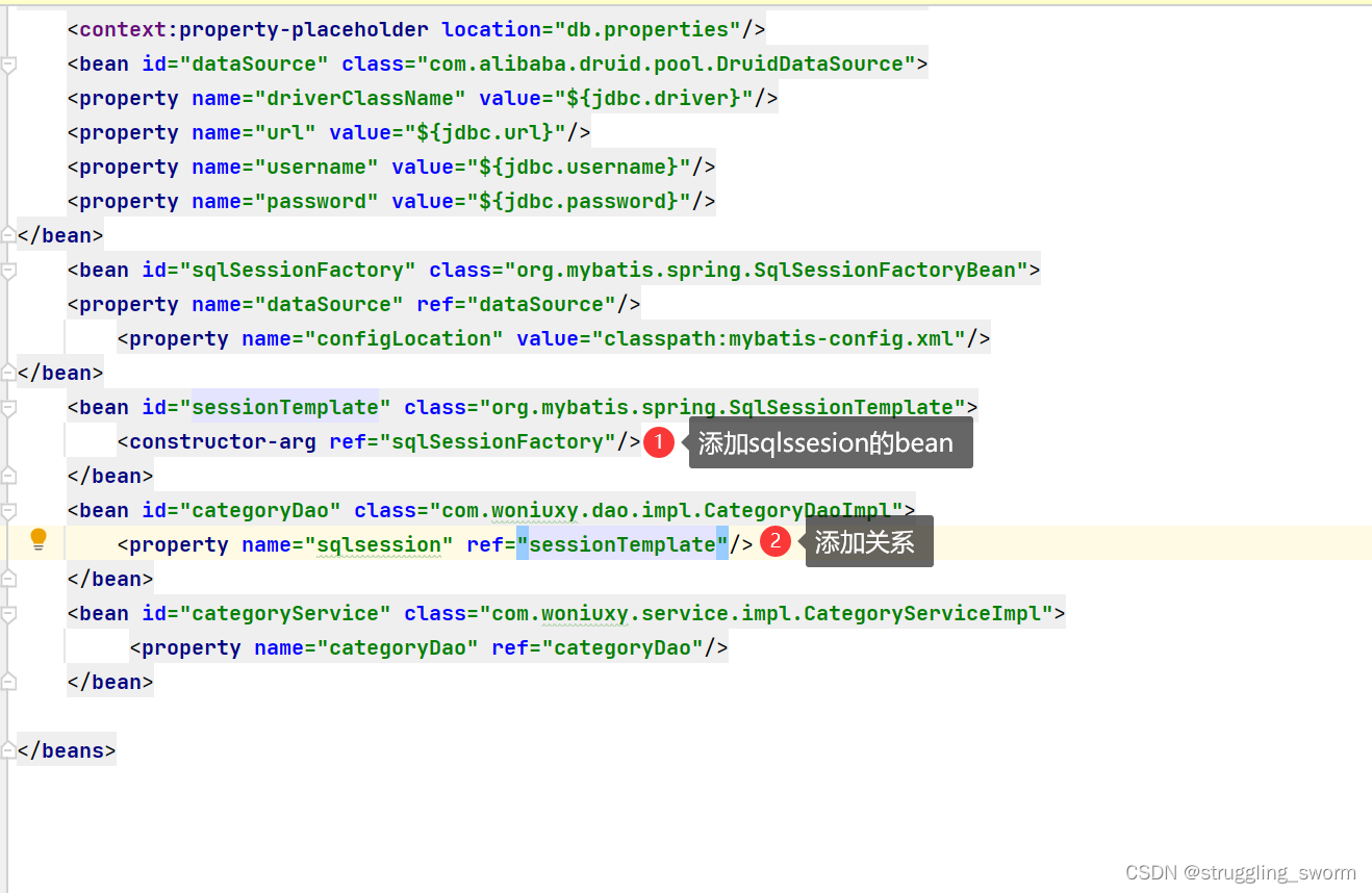 <beans xmlns="http://www.springframework.org/schema/beans"xmlns:xsi="http://www.w3.org/2001/XMLSchema-instance"xmlns:context="http://www.springframework.org/schema/context"xsi:schemaLocation="http://www.springframework.org/schema/beanshttp://www.springframework.org/schema/beans/spring-beans.xsdhttp://www.springframework.org/schema/contexthttp://www.springframework.org/schema/context/spring-context.xsd"><context:property-placeholder location="db.properties"/><bean id="dataSource" class="com.alibaba.druid.pool.DruidDataSource"><property name="driverClassName" value="${jdbc.driver}"/><property name="url" value="${jdbc.url}"/><property name="username" value="${jdbc.username}"/><property name="password" value="${jdbc.password}"/>