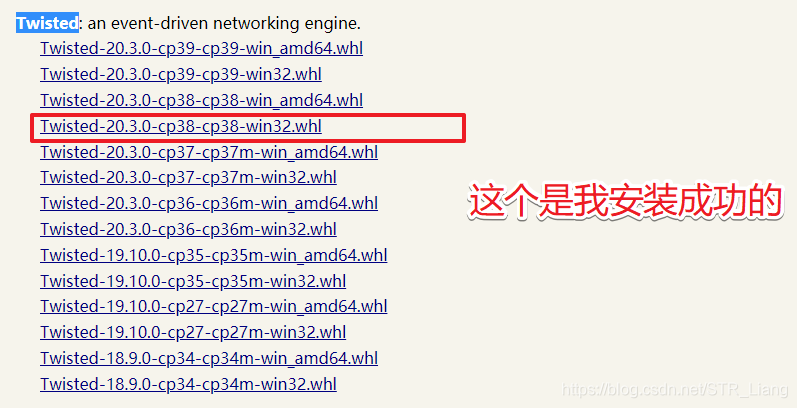 5、通过https://www.lfd.uci.edu/~gohlke/pythonlibs/ 进行搜索Twisted,点进去下载 对应版本的Twisted