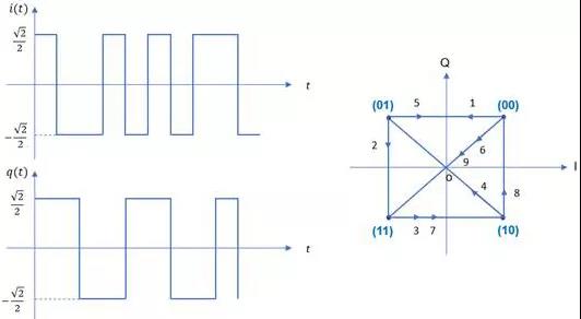 图9. OQPSK调制后得到的基带IQ波形以及矢量轨迹图