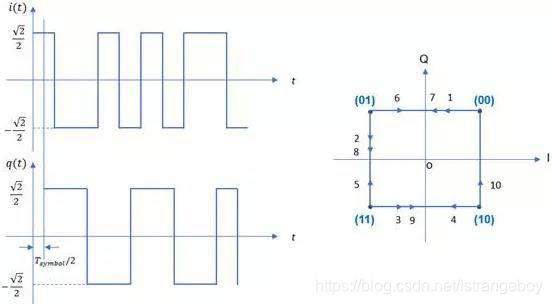 为了规避这种过零点“行为”,通过将Q路信号延迟半个符号周期,此时I 和Q 不会同时为0,符号跳变时也就绕开了原点,如下图所示。这种QPSK调制一般称为Offset QPSK,简称为OQPSK;有的文献称为staggered QPSK,简称为SQPSK。