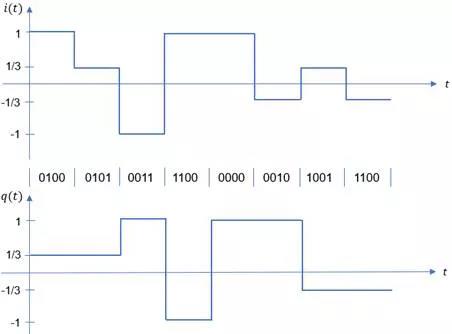图10以16QAM调制为例,给出了常用的映射星座图,具有16个星座点,因此一个符号携带4 bits信息。16QAM调制的I 和Q 路信号为4电平信号,作为示例,图11给出了pattern为“0100 0101 0011 1100 0000 0010 1001 1100” 对应的16QAM调制的基带IQ信号波形。