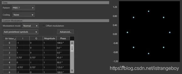 以上简单介绍了常见的几种通用数字调制方式,有时由于系统需要,要求的调制方式比较特殊,这种情况下可以自定义数字调制。自定义数字调制其实就是根据要求自定义星座图,然后按照映射规则实现符号映射,从而完成调制。通常标准测试设备AWG或者VSG都允许用户自定义数字调制,并提供相应的操作界面,图14是Tek一款AWG自定义数字调制的界面,可以直接调整IQ坐标。