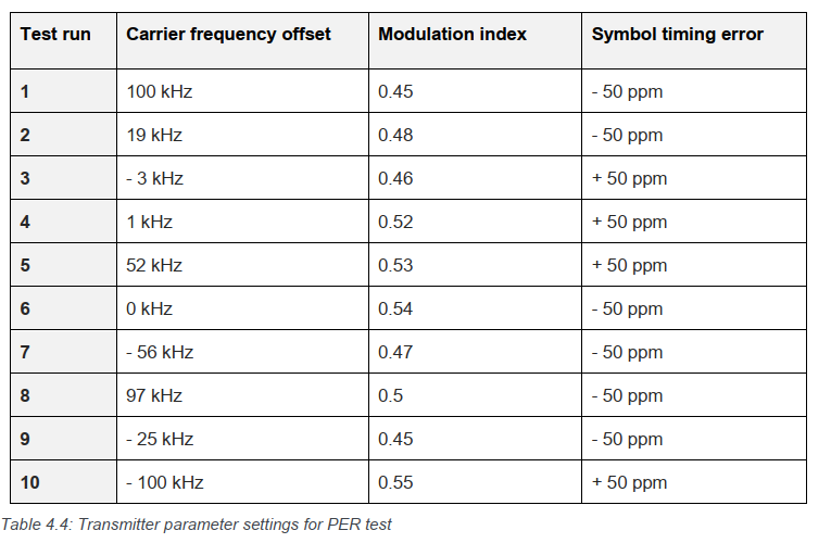 4. 测试人员使用第一个参数集发送前50个数据包; 接下来的50个数据包将使用第二个参数集等进行传输。完成最后一个参数集后,将重复该序列。 PER根据6.4节进行测量