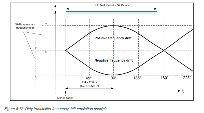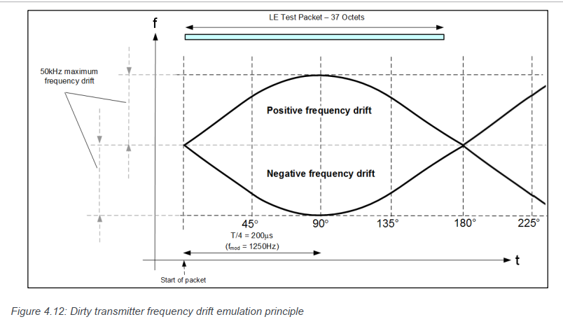 除了固定的频率偏移外,还随时间增加了频率漂移,这是通过向信号添加低频调制来实现的。 调制信号应为正弦曲线,偏差为50 kHz,调制频率为1250 Hz。 调制信号应与包同步,以便包在调制信号的0°和180°处交替开始。 请参见图4.12。