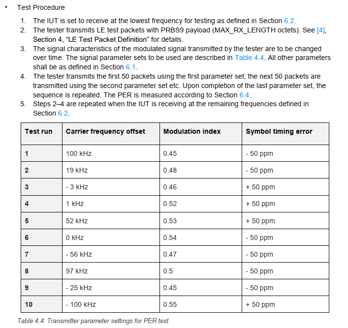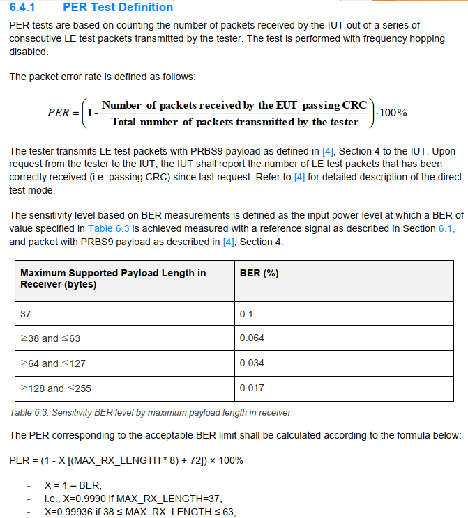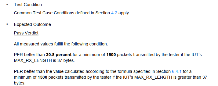 如果IUT的MAX_RX_LENGTH大于37个字节,则对于测试仪发送的至少1500个数据包,PER优于根据6.4.1节中指定的公式计算出的值。
