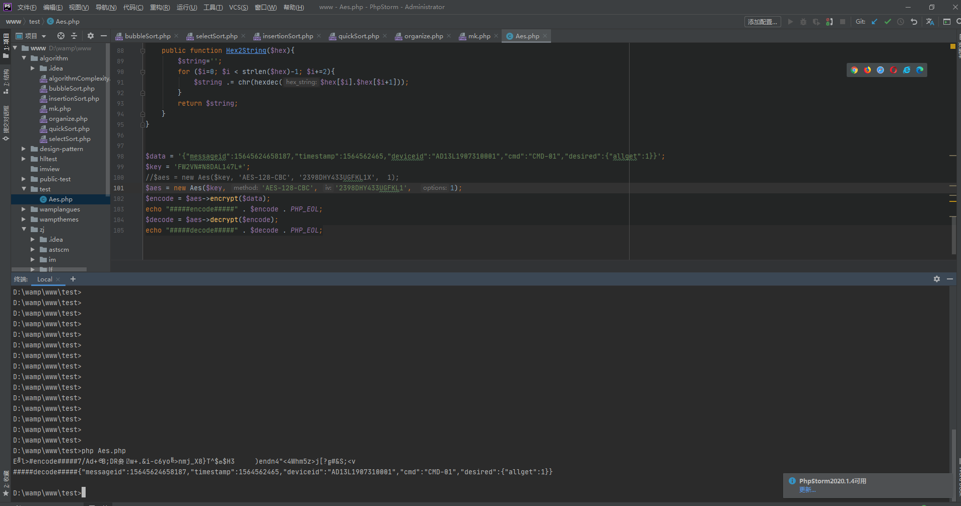 {/*** var string $method 加解密方法,可通过openssl_get_cipher_methods()获得*/protected $method;/*** var string $secret_key 加解密的密钥*/protected $secret_key;/*** var string $iv 加解密的向量,有些方法需要设置比如CBC*/protected $iv;/*** var string $options (不知道怎么解释,目前设置为0没什么问题)*/protected $options;/*** 构造函数** @param string $key 密钥* @param string $method 加密方式* @param string $iv iv向量* @param mixed $options 还不是很清楚**/public function __construct($key, $method = 'AES-128-CBC', $iv = '', $options = 0){// key是必须要设置的$this->secret_key = isset($key) ? $key : exit('key为必须项');$this->method = $method;$this->iv = $iv;$this->options = $options;}/*** 加密方法,对数据进行加密,返回加密后的数据** @param string $data 要加密的数据** @return string**/public function encrypt($data){$en = openssl_encrypt($data, $this->method, $this->secret_key, $this->options, $this->iv);//$en = $this->String2Hex($en);return $en;}/*** 解密方法,对数据进行解密,返回解密后的数据** @param string $data 要解密的数据** @return string**/public function decrypt($data){//$data = $this->Hex2String($data);$de = openssl_decrypt($data, $this->method, $this->secret_key, $this->options, $this->iv);return $de;}public function String2Hex($string){$hex='';