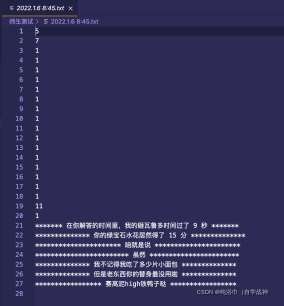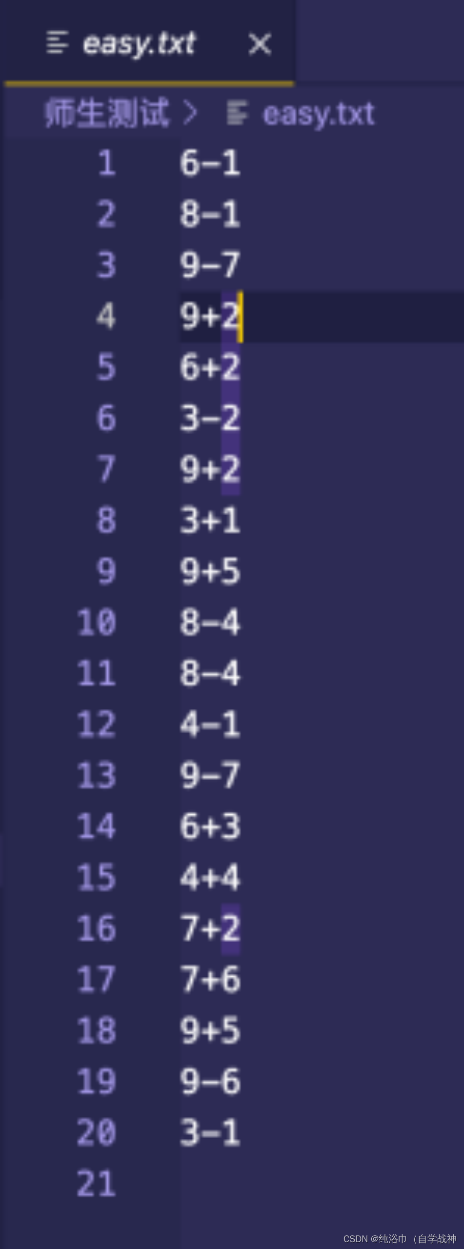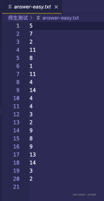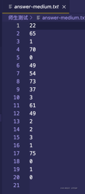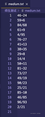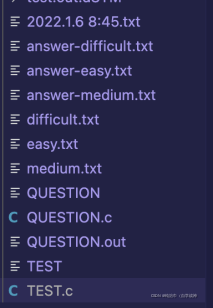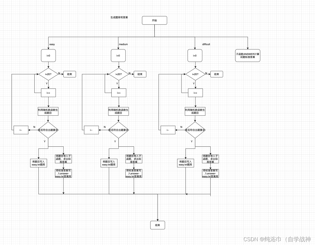 {FILE *question0;FILE *question1;FILE *question2;FILE *open0;FILE *open1;FILE *open2;FILE *A0;FILE *A1;FILE *A2;question0 = fopen("easy.txt","w");question1 = fopen("medium.txt","w");question2 = fopen("difficult.txt","w");open0 = fopen("easy.txt","r");open1 = fopen("medium.txt","r");open2 = fopen("difficult.txt","r");A0 = fopen("answer-easy.txt","w");A1 = fopen("answer-medium.txt","w");A2 = fopen("answer-difficult.txt","w");srand((unsigned)time(NULL));//播种,使得rand()函数在程序运行的每个时刻生成的随机数都是不同的int a,b,k,i,c,N;int v,j,f,l;int a0,a1;T Q[21];P U[21];K DIO[21],JO[21];char x;printf("************************************************************************\n");printf("******************** JO小鬼居然来挑战我DIO大人了 *********************\n");printf("************************************************************************\n");printf("******************** 木大木大木大木大木大木大木大 ********************\n");printf("************************************************************************\n");printf("***************************** 来吧,展示 *****************************\n");printf("************************************************************************\n");printf("************************ The Torld 砸哇路多 **************************\n");printf("************************************************************************\n");//easyfor(i=0;i<20;i++){a=rand()%9+1;//rand()函数直接用了空函数,在这个文件中也没有定义【这样的目的是为了简便】,此后的time()函数也是一样,因为这是对于文件的调用,rand()函数和srand()函数都在头文件stdlib.h中声明了,而函数的实现在源文件中(具体是哪个我目前还不清楚(应该是stdlib.c文件(因为头文件叫stdlib.h,源文件应该是和它重名的),而且这个应该是C自带的源文件),但是一定是C自带的源文件(某.c文件,包含rand()和srand()函数的定义,所有的库函数都是这样的),因此直接用空函数就行,函数直接在源文件(stdlib.c文件)中就实现了【其实原理就是“文件包含”中的对于文件的引用,不过是引用的C自带的头文件罢了】b=rand()%9+1;k=rand()%2;//根据k的返回值来判定生成的是加号还是减号if(a<b)//也可以将内容都改成i--;continue;就是往前倒带{c=a;a=b;b=c;}fprintf(question0,"%d",a);switch(k){case 0:fprintf(question0,"+");x='+';break;case 1:fprintf(question0,"-");x='-';break;}fprintf(question0,"%d\n",b);a0=ANSWER(a,x,b);fprintf(A0,"%d\n",a0);}//mediumfor(i=0;i<20;i++){char m;a=rand()%100+1;b=rand()%100+1;k=rand()%4;switch(k)//根据k的返回值来判定生成哪种运算符{case 0:m='+';break;case 1:m='-';break;case 2:m='*';break;case 3:m='/';break;}int w=ANSWER(a,m,b);if(w<0||w>100){i--;continue;}fprintf(question1,"%d",a);fprintf(question1,"%c",m);fprintf(question1,"%d\n",b);a1=ANSWER(a,m,b);fprintf(A1,"%d\n",a1);} //difficult
