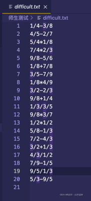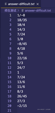 for(i=0;i<20;i++){int q=0,c,d;a=rand()%9+1;b=rand()%9+1;c=rand()%9+1;d=rand()%9+1;k=rand()%4;if(a%b==0||c%d==0){i--;continue;}if(a/b-c/d<0){i--;continue;}else if(b%a==0){b/=a;a=1;fprintf(question2,"%d",a);fprintf(question2,"/");fprintf(question2,"%d",b);}else if(a%b!=0&&b%a!=0){for(q=2;q<10;q++){if(a%q==0&&b%q==0){a/=q;b/=q;}}fprintf(question2,"%d",a);fprintf(question2,"/");fprintf(question2,"%d",b); } switch(k)//根据k的返回值来判定生成哪种运算符{case 0:fprintf(question2,"+");x='+';break;case 1:fprintf(question2,"-");x='-';break;case 2:fprintf(question2,"*");x='*';break;case 3:fprintf(question2,"/");x='/';break;}if(d%c==0){d/=c;c=1;fprintf(question2,"%d",c);fprintf(question2,"/");fprintf(question2,"%d\n",d);}else if(c%d!=0&&d%c!=0){for(q=2;q<10;q++){if(c%q==0&&d%q==0){c/=q;d/=q;}}fprintf(question2,"%d",c);fprintf(question2,"/");fprintf(question2,"%d\n",d);}if(x=='+'){v=a*d;j=c*b;f=b*d;l=v+j;if(l%k==0){fprintf(A2,"%d\n",l/f);}else if(f%l==0){fprintf(A2,"1");fprintf(A2,"/");fprintf(A2,"%d\n",k/l);}else if(l%f!=0&&f%l!=0){for(int NN=2;NN<10;NN++){if(l%NN==0&&f%NN==0){l/=NN;f/=NN;}}fprintf(A2,"%d",l);fprintf(A2,"/");fprintf(A2,"%d\n",f);}}else if(x=='-'){v=a*d;j=c*b;f=b*d;l=v-j;if(l%f==0){fprintf(A2,"%d\n",l/f);}else if(f%l==0){fprintf(A2,"1");fprintf(A2,"/");fprintf(A2,"%d\n",f/l);}else if(l%f!=0&&f%l!=0){for(int NN=2;NN<10;NN++){if(l%NN==0&&f%NN==0){l/=NN;f/=NN;} }fprintf(A2,"%d",l);fprintf(A2,"/");fprintf(A2,"%d\n",f);}}else if(x=='*'){l=a*b;f=c*d;if(l%f==0){fprintf(A2,"%d\n",l/f);}else if(f%l==0){fprintf(A2,"1");fprintf(A2,"/");fprintf(A2,"%d\n",f/l);}else if(l%f!=0&&f%l!=0){for(int NN=2;NN<10;NN++){if(l%NN==0&&f%NN==0){l/=NN;f/=NN;} }fprintf(A2,"%d",l);fprintf(A2,"/");fprintf(A2,"%d\n",f);}}else if(x=='/'){l=a*d;f=b*c;if(l%f==0){fprintf(A2,"%d\n",l/f);}else if(f%l==0){fprintf(A2,"1");fprintf(A2,"/");fprintf(A2,"%d\n",f/l);}else if(l%f!=0&&f%l!=0){for(int NN=2;NN<10;NN++){if(l%NN==0&&f%NN==0){l/=NN;f/=NN;} }fprintf(A2,"%d",l);fprintf(A2,"/");fprintf(A2,"%d\n",k);}}}fclose(question0);fclose(question1);fclose(question2);fclose(open0);fclose(open1);fclose(open2);fclose(A0);fclose(A1);fclose(A2);return 0;