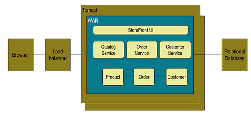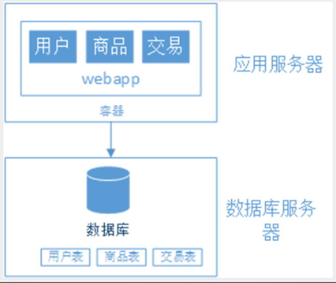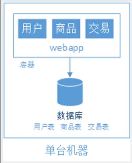 上图这种将所有功能都部署在一个web容器中运行的系统就叫做巨石型应用。