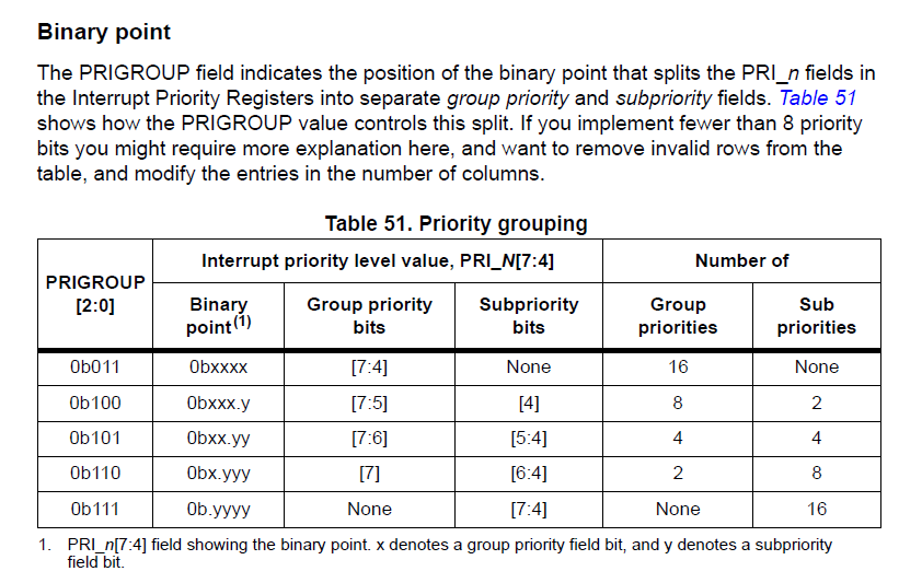 从上图可以知道中断分组是由寄存器AIRCR的Bits 10:8 PRIGROUP控制。至于PRI_N就是各个中断根据分组的单独的组优先级和响应级字段。