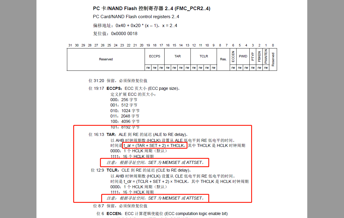 由下图手册得知:t_clr = (TCLR + SET + 2) × THCLK ;其中 TCLR 是我们软件CLE low to RE low delay in HCLK cycles的设置值,而SET手册也有写 “注意: 根据寻址空间,SET 为 MEMSET 或 ATTSET”。芯片手册tCLR = 10ns