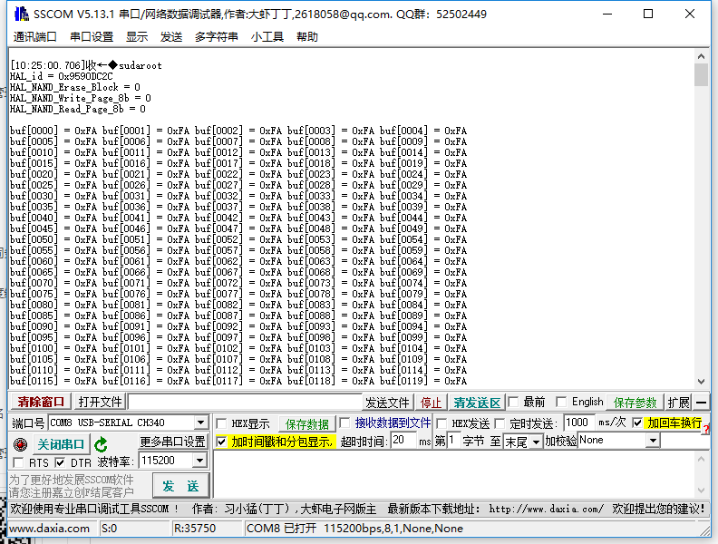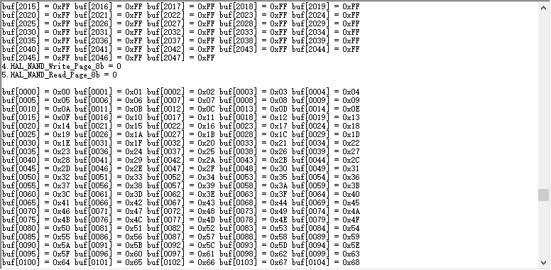 5、重新读取芯片第0页数据,并打印HAL_NAND_Read_Page_8b函数执行结果,数据0x00~0xFF循环,正确。