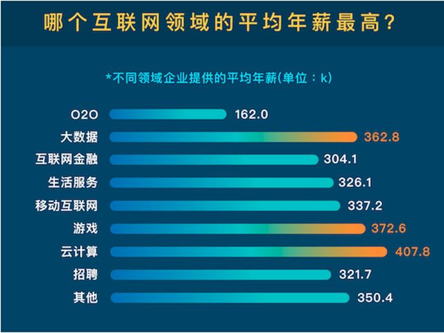 在互联网领域的平均薪资排行中,云计算、大数据和游戏稳居前三把交椅。其中云计算领域企业在 100offer 上发出的平均面邀年薪超过 40 万,游戏领域则受益于去年以来从《阴阳师》到《王者荣耀》的全民手游热,冲上了排名第二的位置。