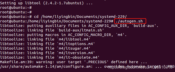 解决方法:当执行 “apt-get install libtool”提示升级到libtool (2.4.2-1.7ubuntu1)后,此时再次执行./autogen.sh没有以上异常