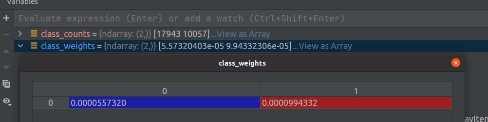 weights (list)每张图片的比重,要么5.57320403e-05,要么9.94332306e-05
