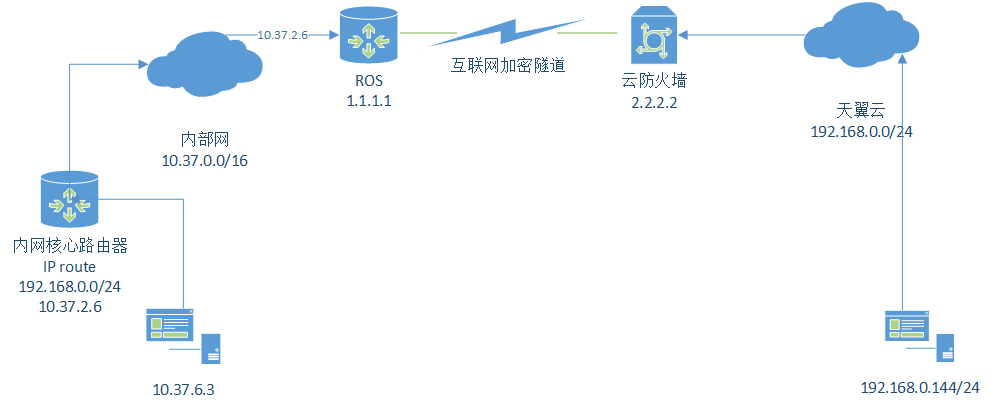 内网网段10.37.0.0/16,有一台通过vsphere部署的ros虚拟机运行了6.4版本的软路由,开启IPSEC功能与天翼云侧对接Site-to-Site方式的连接,对接完成后可以实现内网10.37.0.0/16与天翼云侧内网192.168.0.0/24互通,双方主机可以直接通过对方内网IP进行通信,接入速率取决于内网接入互联网的速度。
