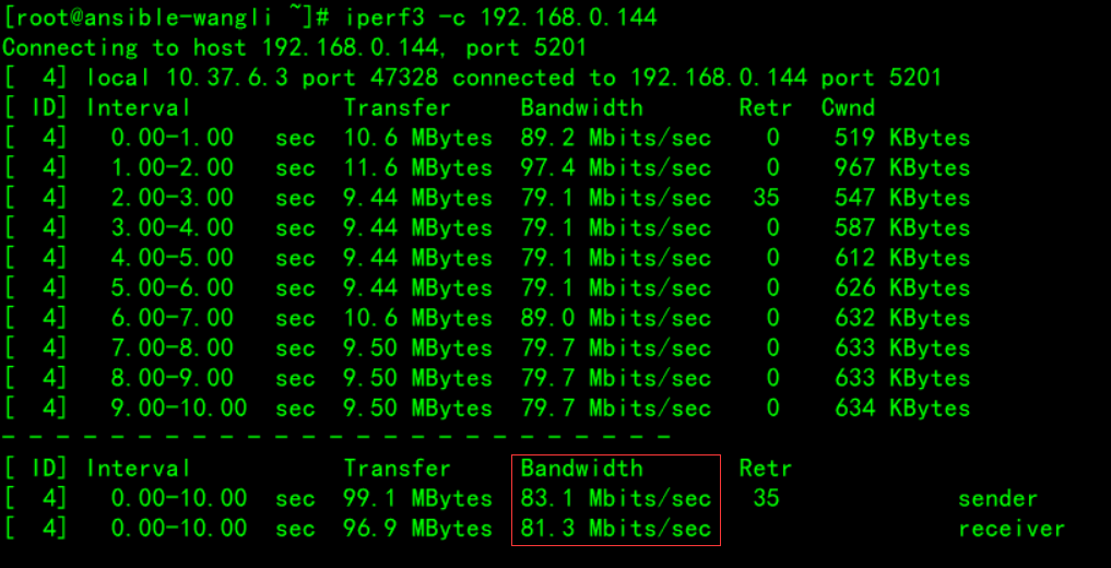 由于内网接入互联网的网速为100M,我们看通过IPSEC建立专网后,两个内网的通信速度有多快,这里还是使用iperf3测试网速,通过内网10.37.6.3直接测试到云主机192.168.0.144的网速为83M,这里的速度大部分情况下取决于用户接入互联网的带宽,如果用户超过了300M的接入带宽,则速度瓶颈会体现在云侧,正如昨天的实验中体现出来的云侧最高接入速度在330M左右。