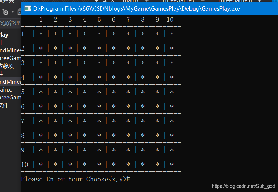 {srand((unsigned long)time(NULL));char Show_board[ROW1][COL1];char Mine_board[ROW1][COL1];memset(Show_board, STYLE, sizeof(Show_board));memset(Mine_board, '0', sizeof(Mine_board));SetMines(Mine_board, ROW1, COL1);int count = (ROW1 - 2)*(COL1 - 2) - NUM;while (count){system("cls");ShowBoard(Show_board, ROW1, COL1);int x = 0;int y = 0;printf("Please Enter Your Choose<x,y>#");scanf("%d %d", &x, &y);if (x<1 || x>(ROW1 - 1) || y<1 || y>(COL1 - 1)){printf("Your Choose Is Error! Please Try Again\n");continue;}if (Show_board[x][y] != STYLE){printf("Your Choose Is Error! Please Try Again\n");continue;}if (Mine_board[x][y] == '1'){printf("Game over!\n");break;}Show_board[x][y] = CountMines(Mine_board, x, y);count--;}ShowBoard(Mine_board, ROW1, COL1);