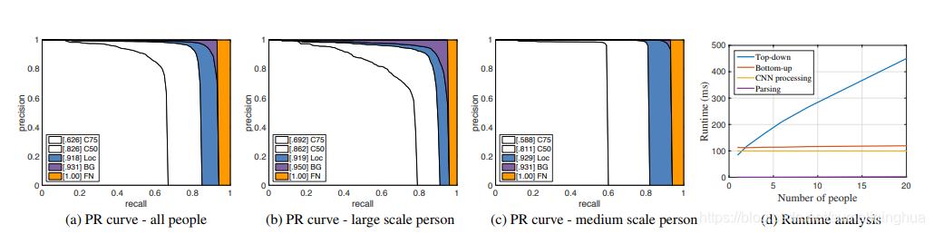 为了分析我们方法的运行时性能,我们收集含有不同人数的视频。原本的帧大小为1080×1920,我们将其调整为368×654在测试期间调整到适合GPU内存大小。运行时分析是在配备一块NVIDIA GeForce GTX-1080 GPU的笔记本电脑上进行的。在Figure 8d中,我们使用人物检测和单人CPM作为自上而下的比较,它们运行时间大致与人数成正比。相比之下,我们自下而上的方法的运行时间随着人数的增加,增长相对缓慢。运行时间由两个主要部分组成:(1)CNN处理时间,其运行时复杂度为O(1),常量为不断变化的人数; (2)多人解析运行时复杂度为 O ( n 2 ) O(n^2) O(n2),其中n代表人数。但是,解析时间不会显着影响整体运行时间,因为它比CNN处理小两个数量级。例如,对于9个人来说,解析需要0.58毫秒,CNN需要99.6毫秒。我们的方法已经达到了一个19人的视频8.8 fps的效果。