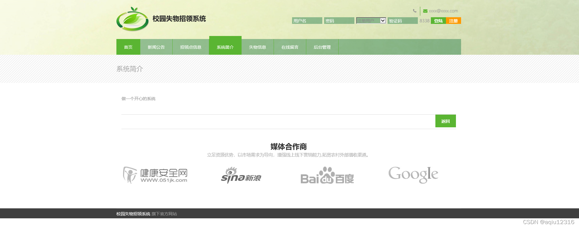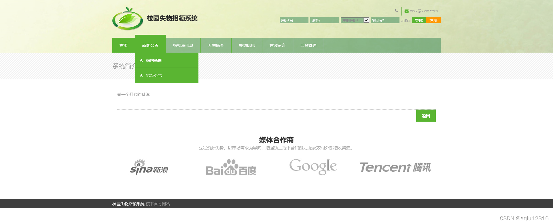 (1)新闻公告:该模块主要实现站内新闻信息查看,招领公告信息查看。