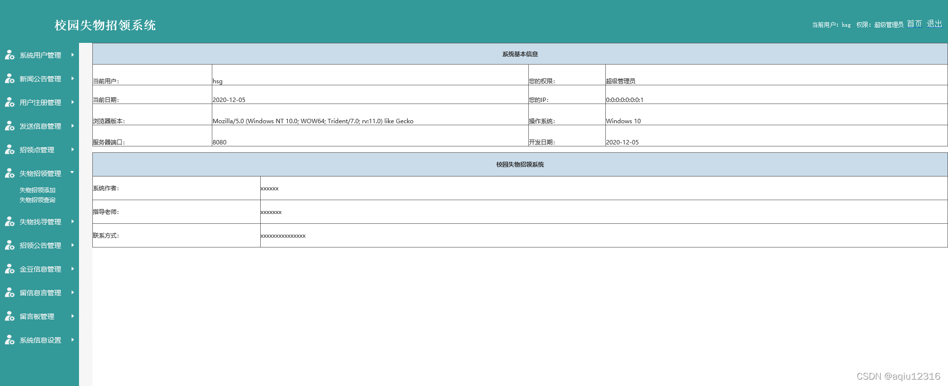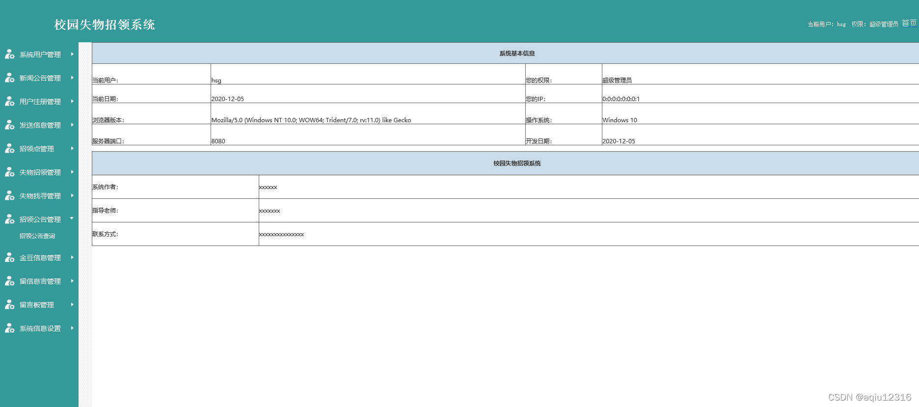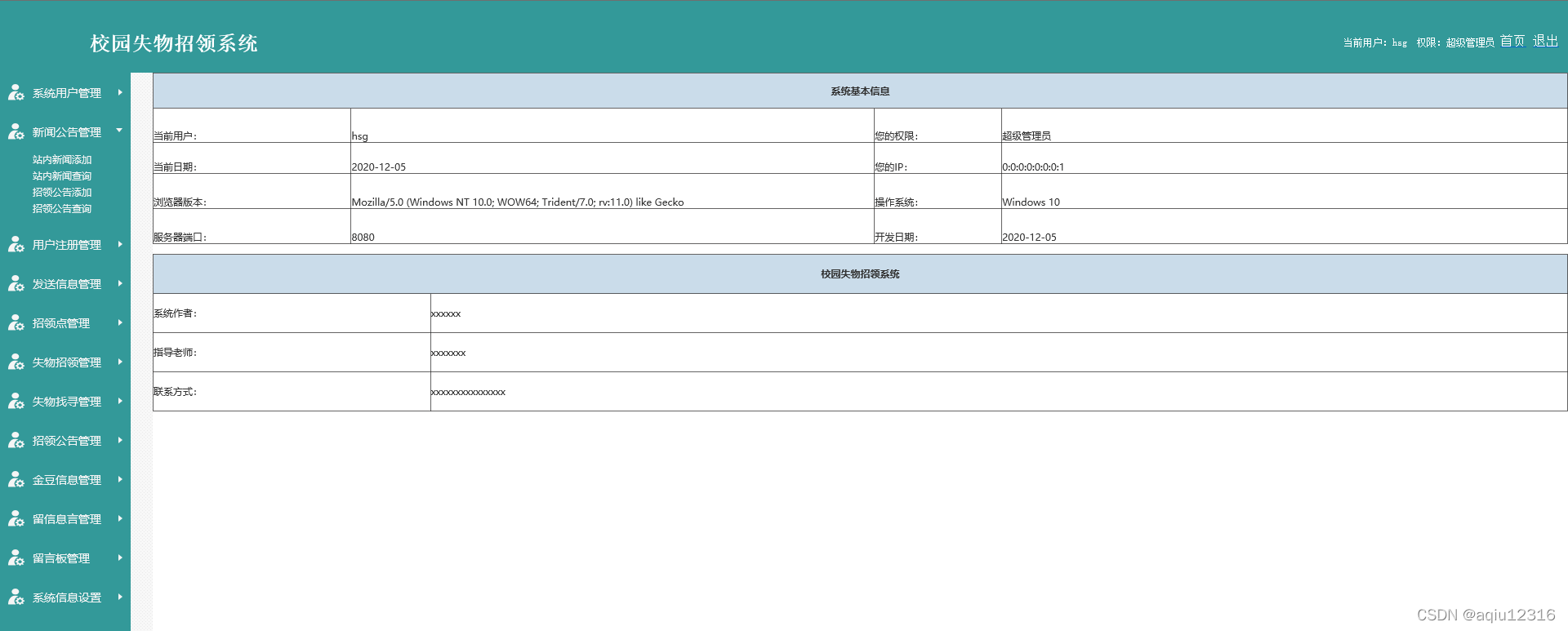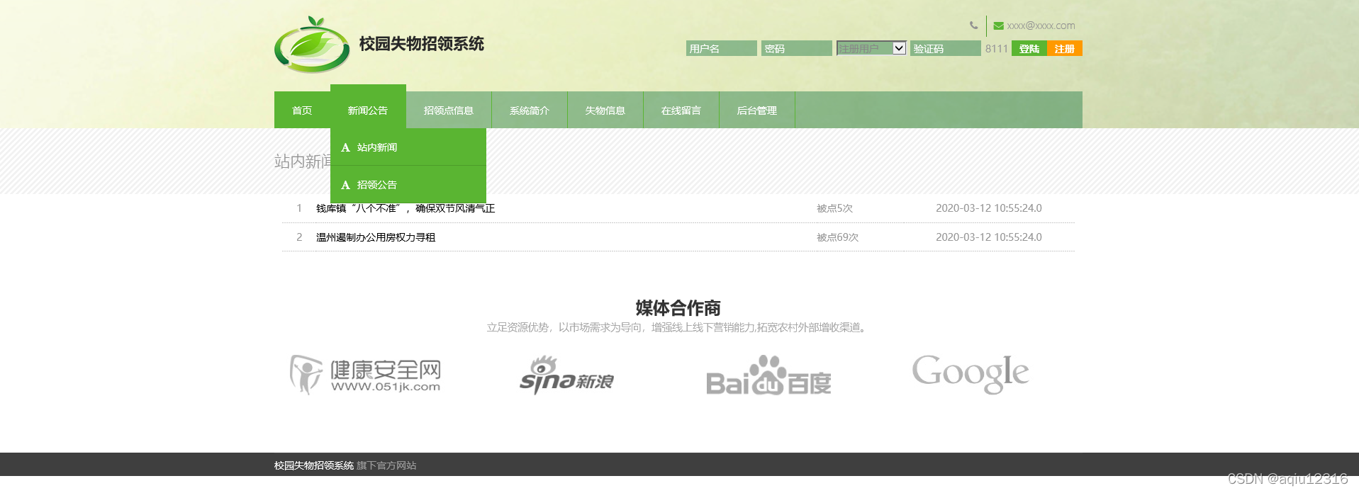 (2)新闻公告管理:主要实现新闻公告信息添加和查看,以及招领公告信息的添加和查看。