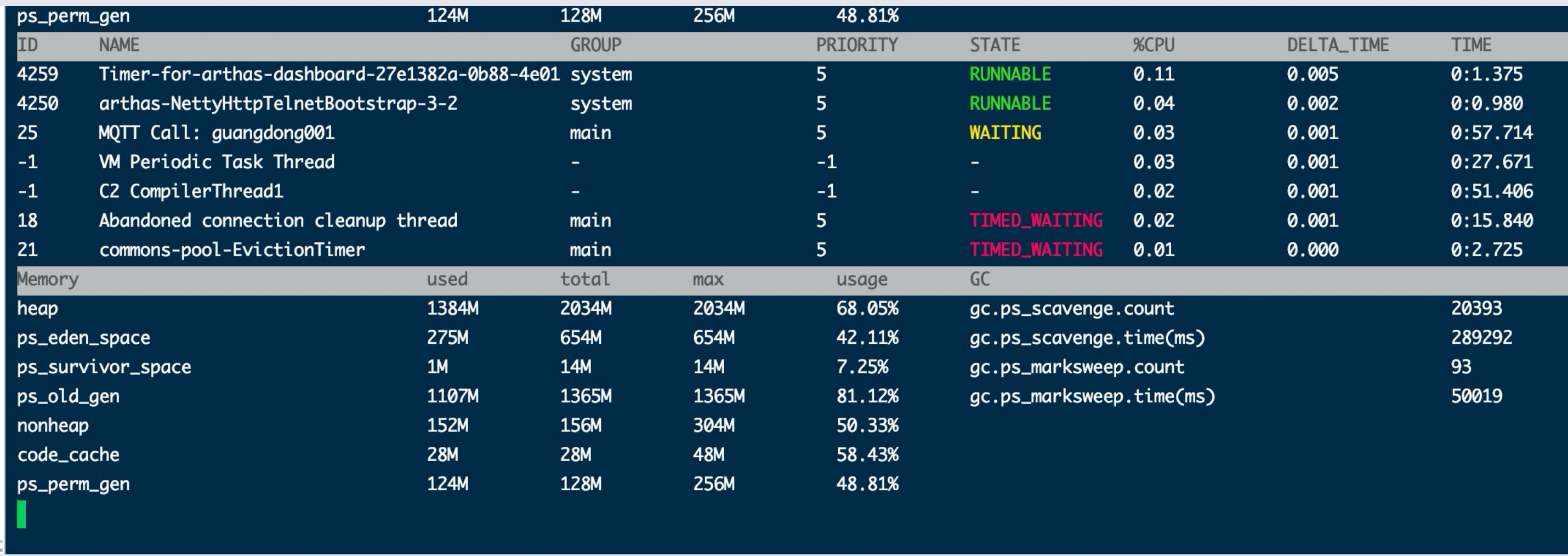 看样子不是在full gc,老年代虽说占用了80%,但是还不足以频繁full gc。