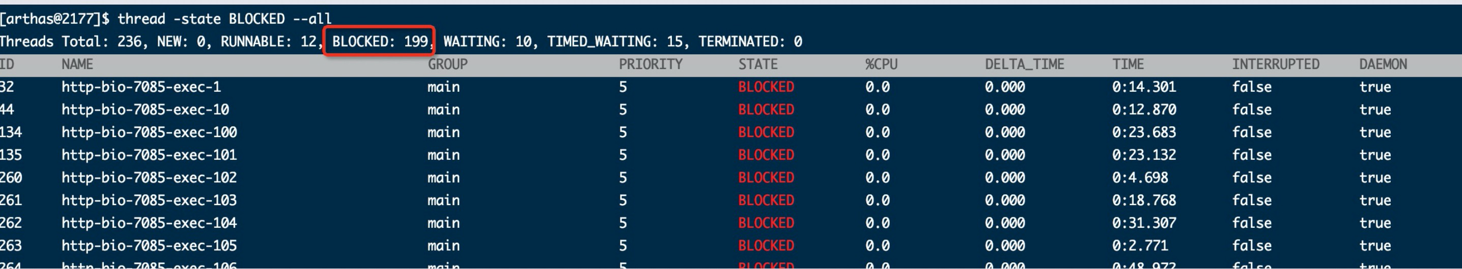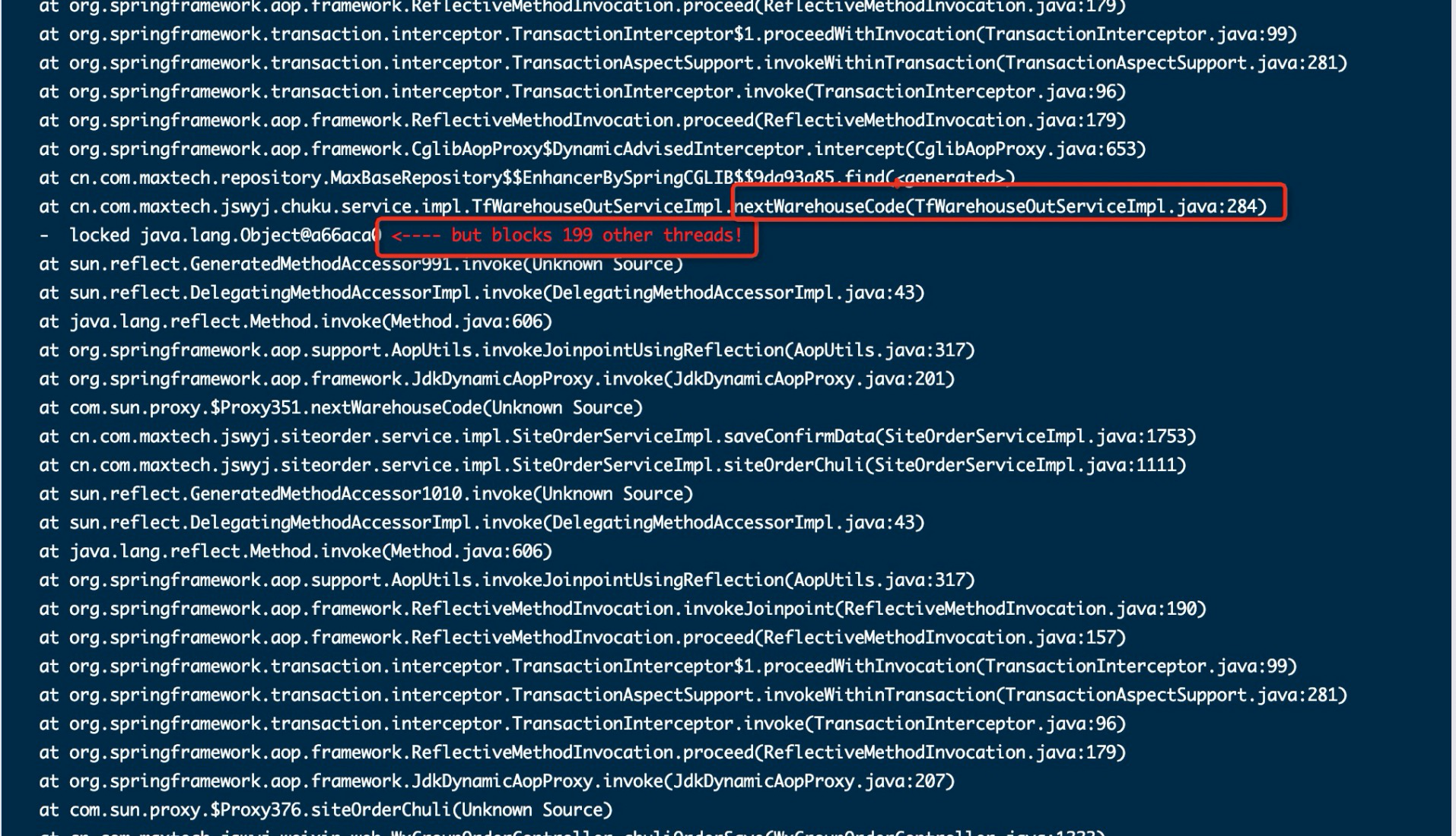 发现arthas提示了but blocks 199 other threads 说明这个位置阻塞了199条其他的线程的运行。