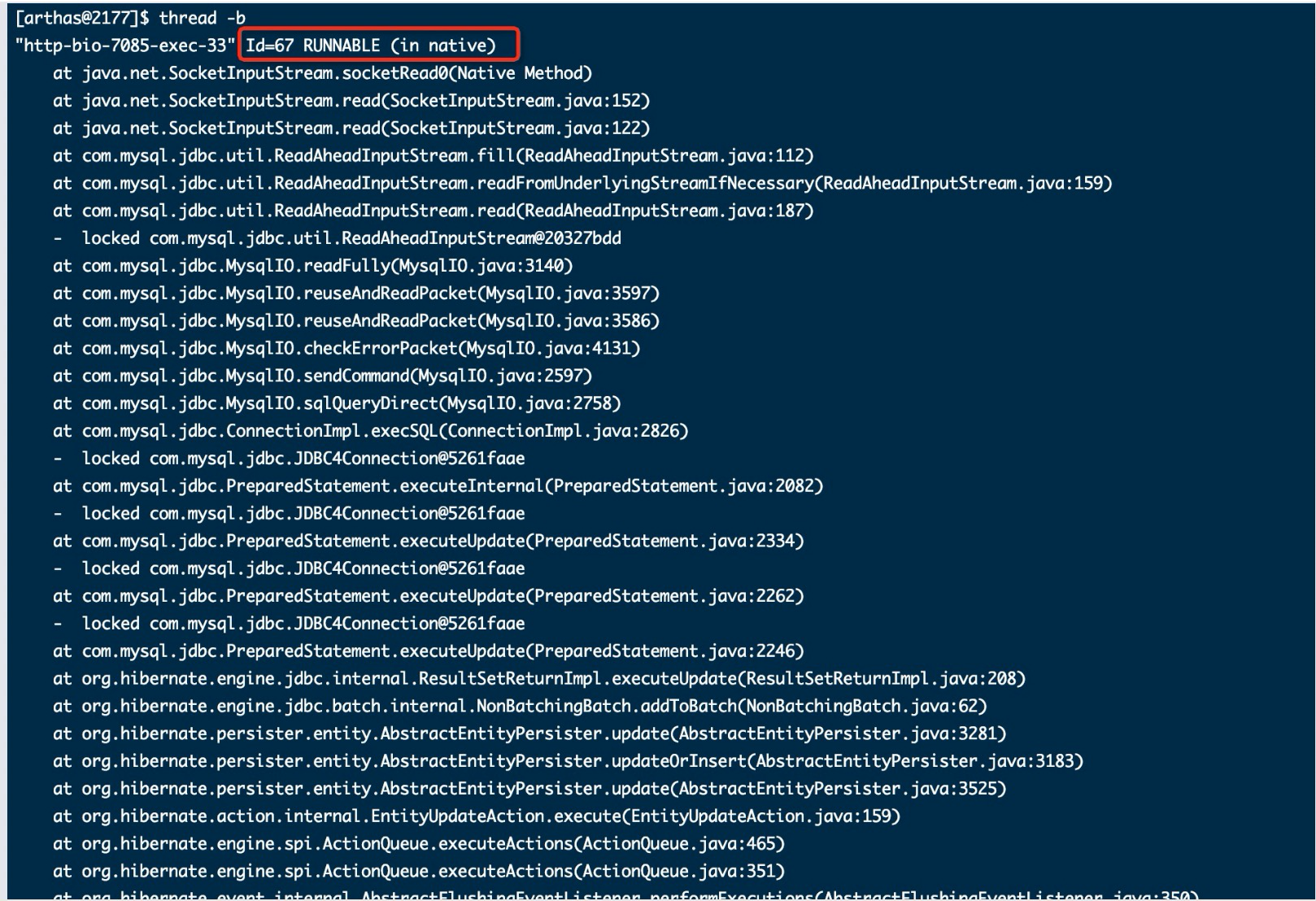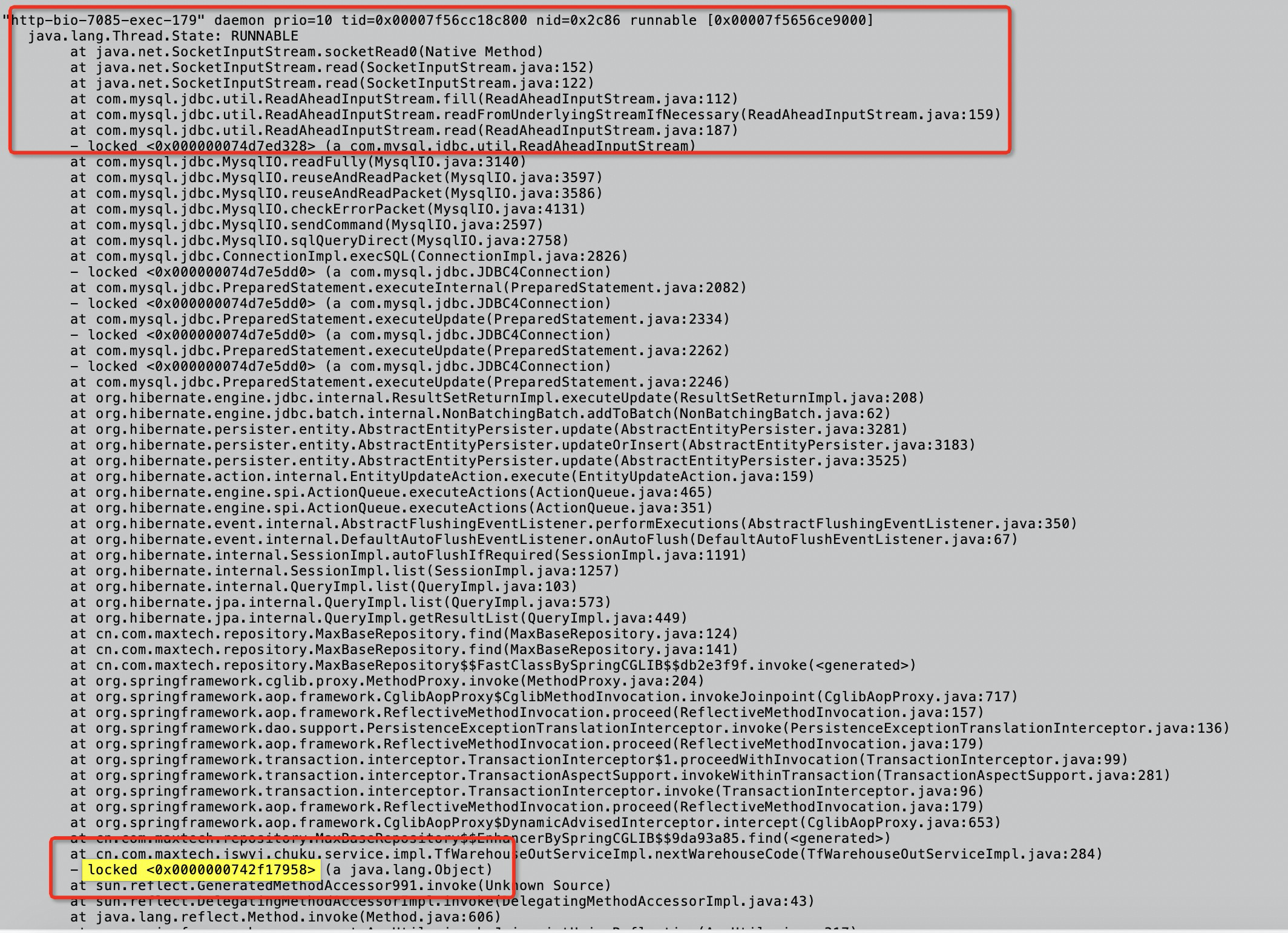 发现是被http-bio-7085-exec-179个线程拿着呢,但是它拿着锁,一直在等待mysql socket tcp的响应