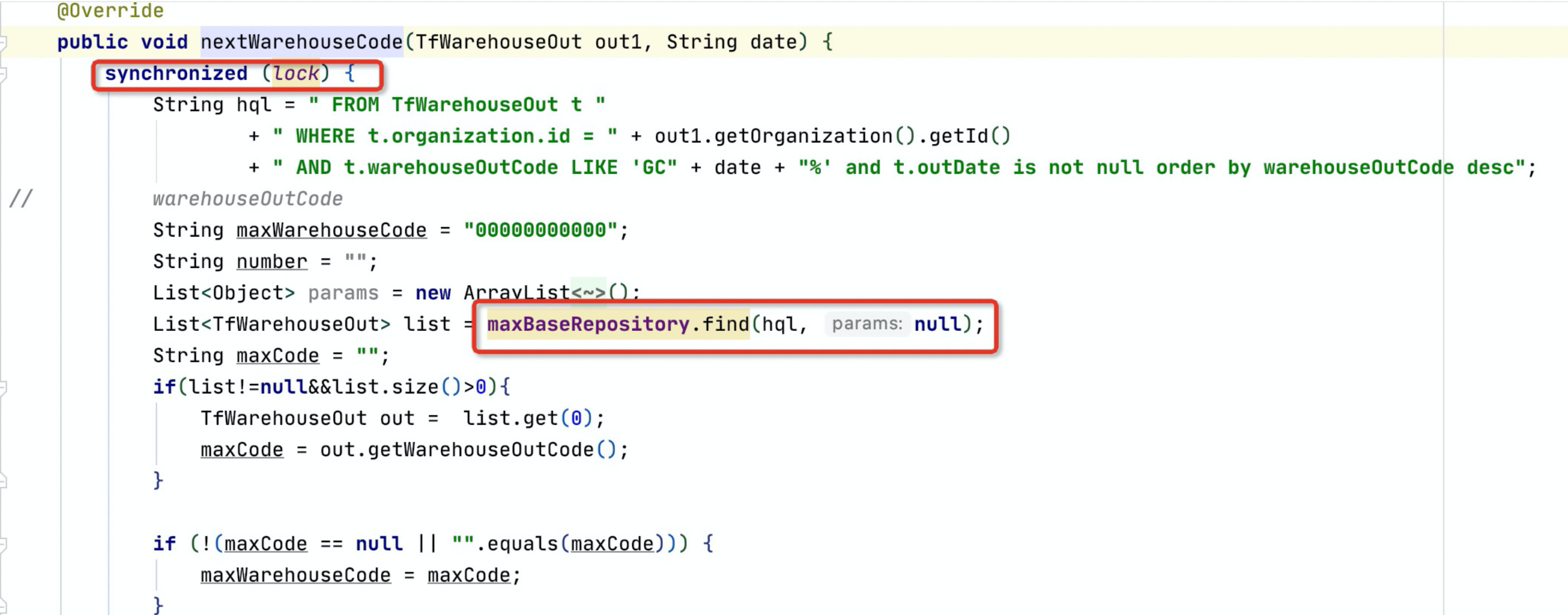 上一步可以发现出问题的是TfWarehouseOutServiceImpl类的nextWarehouseCode方法