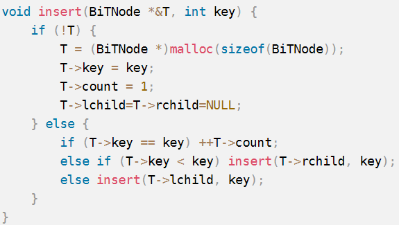 }BiTNode, *BiTree;void insert(BiTNode *&T, int key) {if (!T) {T = (BiTNode *)malloc(sizeof(BiTNode));T->key = key;T->count = 1;T->lchild=T->rchild=NULL;} else {if (T->key == key) ++T->count;else if (T->key < key) insert(T->rchild, key);else insert(T->lchild, key);}