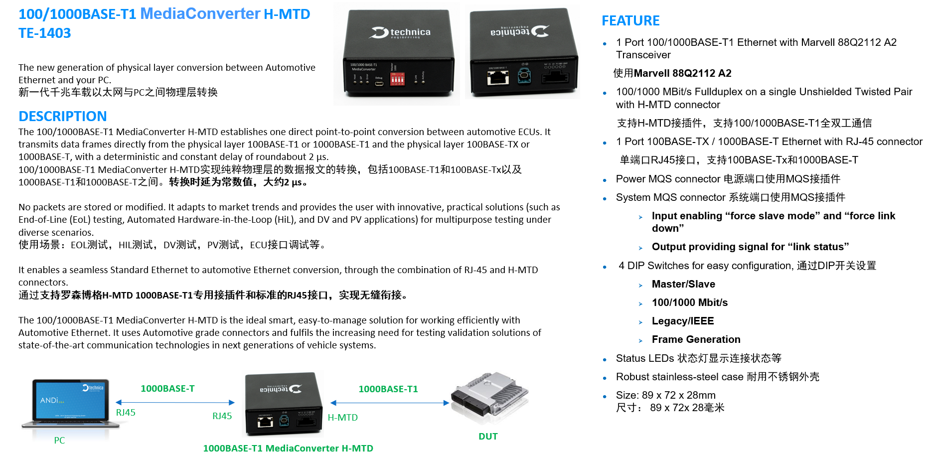 Technica提供完整的车载以太网仿真测试软件和硬件,包括TC8物理层互操作性测试的Golden Device, 以及功能测试模块;