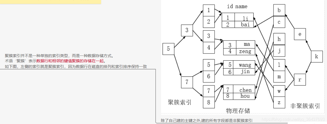 聚簇索引:数据行的物理顺序与列值(一般是主键的那一列)的逻辑顺序相同,一个表中只能拥有一个聚集索引。