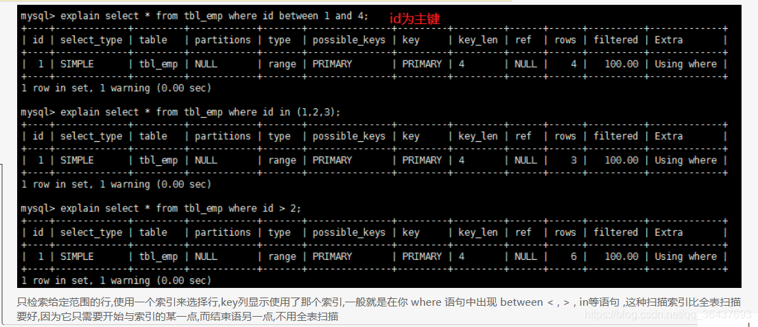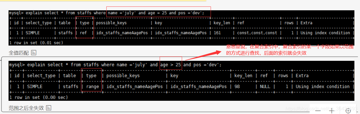 通俗点:在复合索引,在连续的索引字段中,如果某一个字段按照范围查找,后面的索引字段就会失效。相比之前的执行计划中的type类型也会上升一级变为range