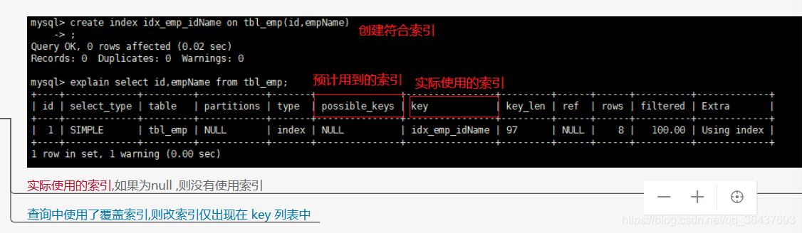 注意:针对上面的问题,如何不要索引失效,实现覆盖索引,覆盖索引(你建的索引和你查的字段个数顺序上最好完全一致),也就是说创建的索引的复合索引,在进行查询的时候,执行的是覆盖索引。