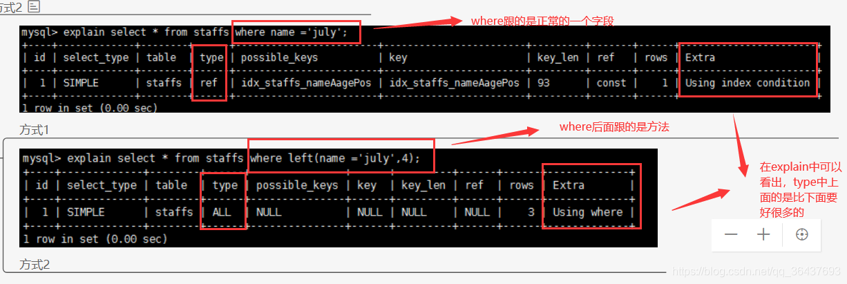 2、不在索引where列上做任何操作,(计算,函数,(自动or手动)类型转换),会导致索引失效转向全表扫描