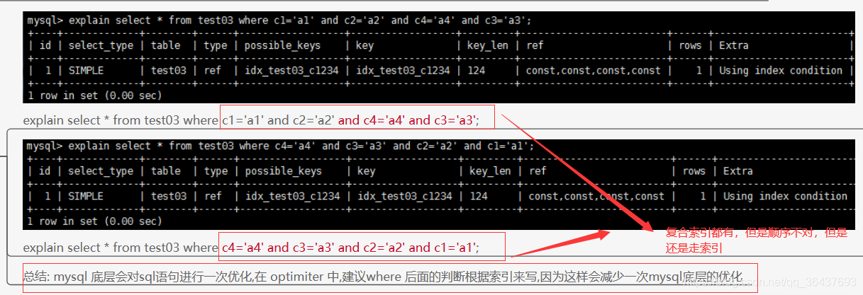 看到下面可以看出在复合索引,都存在但是顺序不一致,但是还是走索引,这是mysql底层进行的一个内部调节
