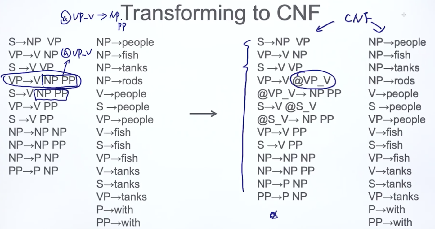 三值规则处理,把其中两个值合并,形成新的值,截图的VP→V NP PP,把后面两个NP PP合并起来,并起名:@VP_V,并加入规则:@VP_V→NP PP