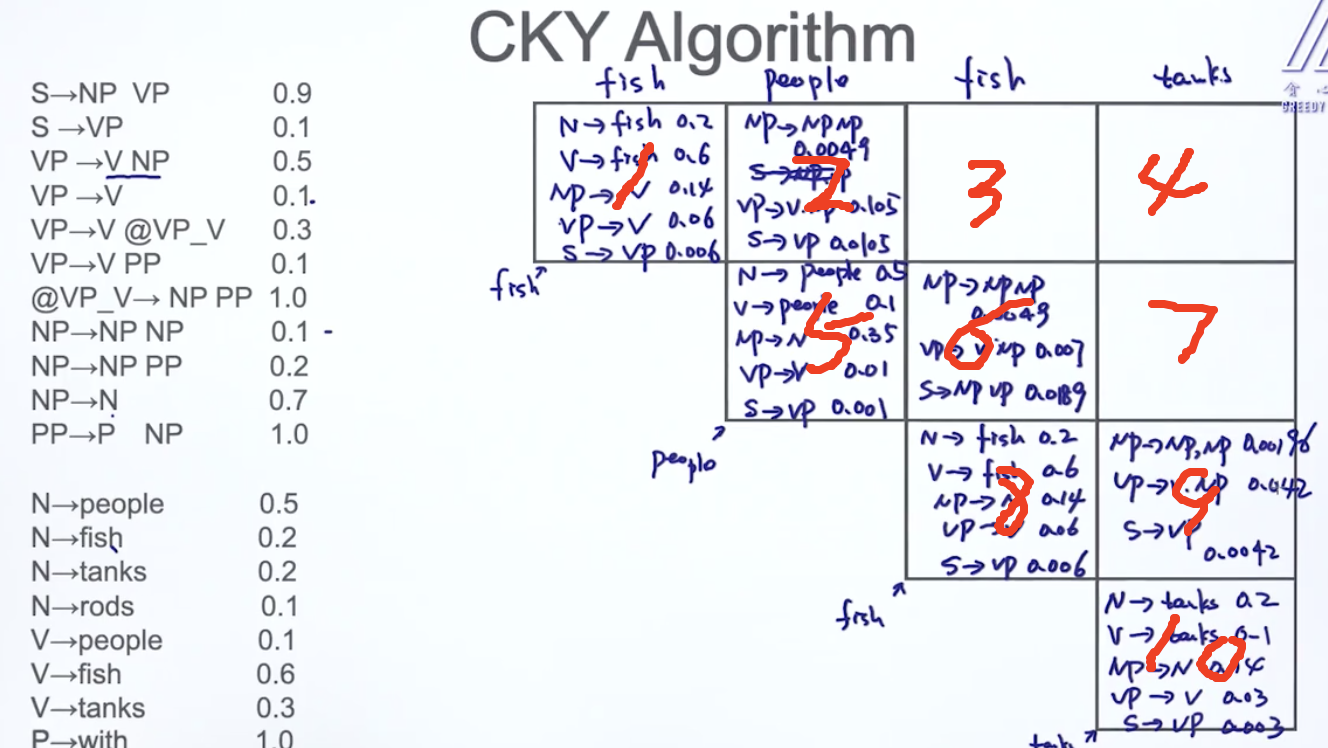 例如:NP→NP NP=(NP→NP NP)× (NP→N这个是fish格子)×(NP→N这个是people格子)=0.1× 0.14× 0.35=0.0049