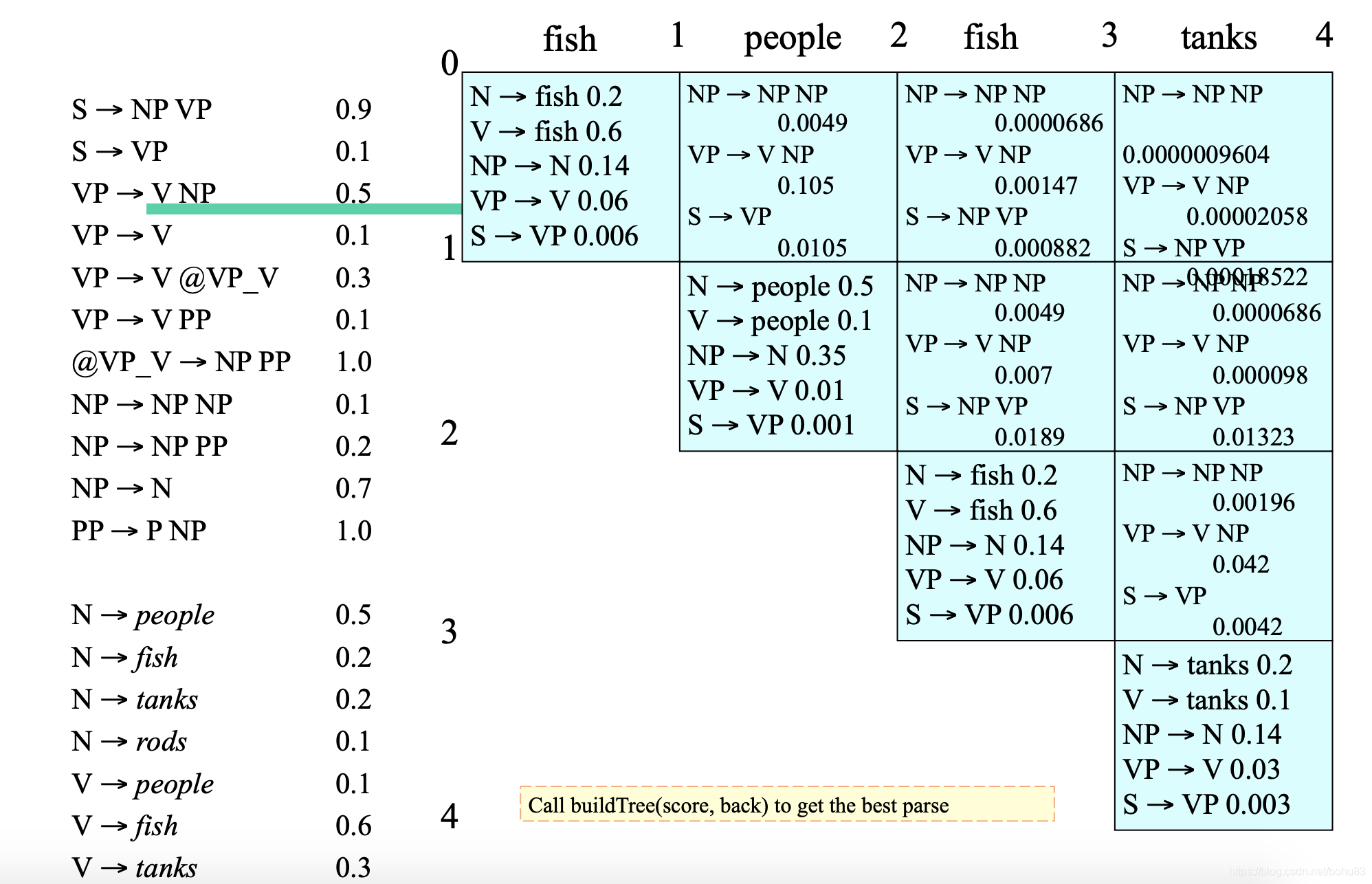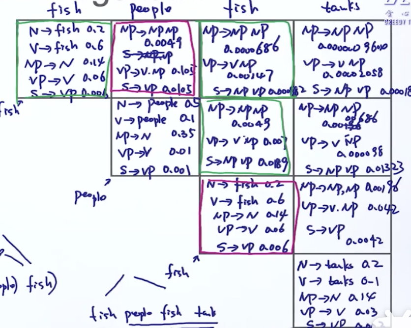 VP→V NP=(V NP)× (V→这个是fish格子)×(NP→N这个是people格子)= 0.5×0.6×0.35=0.105