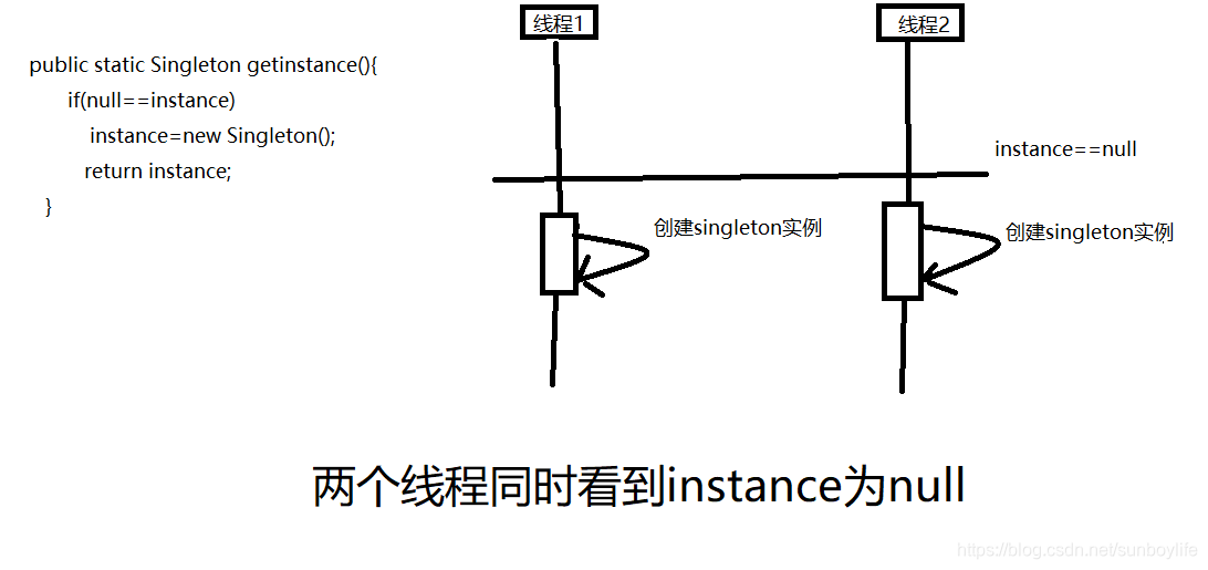 Singleton的磊便连放instance=null,因此当Singleton.class被初始化的时候instance并不会被实例化,在getinstance方法中会判断instance实例是否被实例化,看起来没有什么问题,但是将getinstance方法放在多线程环境下进行分析,则会导致instance被实例化一次以上,并不能保证单例的唯一性。