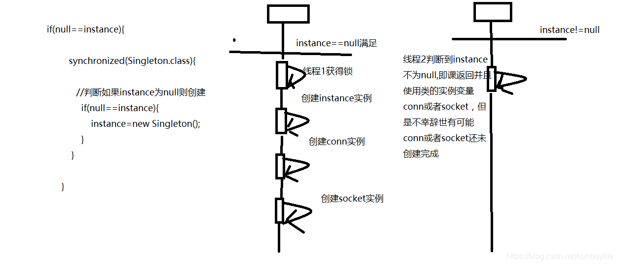两个线程同时看到instance==null,那么instance讲无法保证单例的唯一性