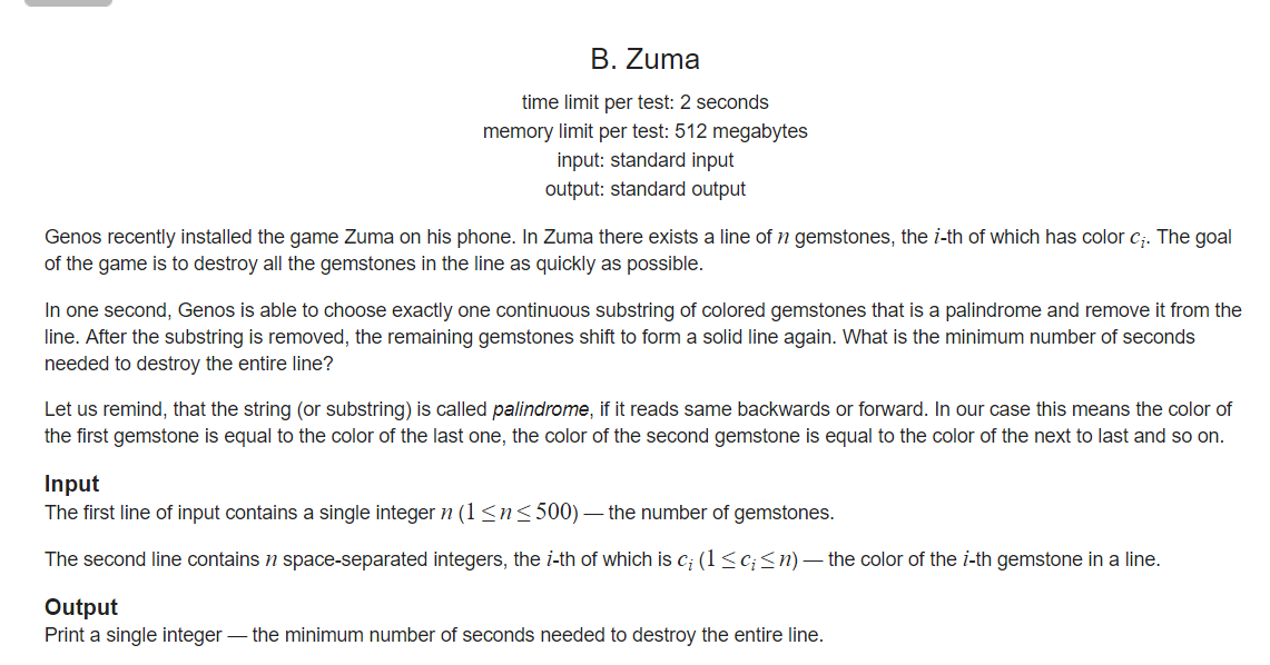 本文主要是介绍【区间dp】Codeforces Round 336 (Div 2) D Zuma,希望对大家解决编程问题提供一定的参考价值,需要的开发者们随着小编来一起学习吧!