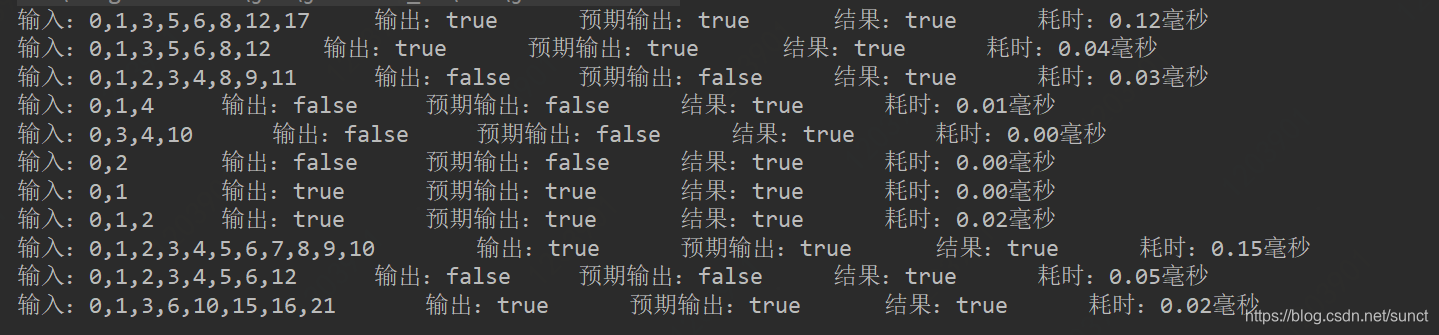 public class CanCross403 {public boolean canCross(Integer[] stones) {if (stones == null || stones.length < 2) {return true;}if (stones.length == 2) {return stones[1] == 1;}int[] res = new int[1]; //判断是否达到了最后一个节点,如果达到了,说明青蛙可以过河Map<Integer, Boolean> map = new LinkedHashMap<Integer, Boolean>();allowJump(stones, 0, 0, map, res);return res[0] == 1;}private void allowJump(Integer[] stones, int pos, int jump, Map<Integer, Boolean> map, int[] res) {if (res[0] != 1 && pos >= stones.length - 1) {res[0] = 1;return;}//一开始使用"pos:jump:i"字符串作为缓存,但是其实只用“pos:jump”就可以了// 最后为了提高速度,改成整型位运算Integer mark = pos ^ (jump << 11);if (map.containsKey(mark)) {return;}for (int i = pos + 1; i < stones.length; i++) {int dist = stones[i] - stones[pos];//如果dist小于jump-1,需要继续执行if (dist < jump - 1) {continue;}if (dist <= jump + 1) {map.put(mark, true);if (res[0] != 1) { //如果青蛙已过河,则不需要再进行计算了allowJump(stones, i, dist, map, res);}} else {//如果dist大于jump+1,那么后面都一定是大于jump+1,则直接退出,不需要计算map.put(mark, false);return;}}}public static void main(String[] args) {List<AlgoHelper.InputParams<Integer[], Boolean>> datas = new ArrayList<>();datas.add(new AlgoHelper.InputParams<>(new Integer[]{0, 1, 3, 5, 6, 8, 12, 17}, true));datas.add(new AlgoHelper.InputParams<>(new Integer[]{0, 1, 3, 5, 6, 8, 12}, true));datas.add(new AlgoHelper.InputParams<>(new Integer[]{0, 1, 2, 3, 4, 8, 9, 11}, false));datas.add(new AlgoHelper.InputParams<>(new Integer[]{0, 1, 4}, false));datas.add(new AlgoHelper.InputParams<>(new Integer[]{0, 3, 4, 10}, false));datas.add(new AlgoHelper.InputParams<>(new Integer[]{0, 2}, false));datas.add(new AlgoHelper.InputParams<>(new Integer[]{0, 1}, true));datas.add(new AlgoHelper.InputParams<>(new Integer[]{0, 1, 2}, true));datas.add(new AlgoHelper.InputParams<>(new Integer[]{0, 1, 2, 3, 4, 5, 6, 7, 8, 9, 10}, true));datas.add(new AlgoHelper.InputParams<>(new Integer[]{0, 1, 2, 3, 4, 5, 6, 12}, false));datas.add(new AlgoHelper.InputParams<>(new Integer[]{0, 1, 3, 6, 10, 15, 16, 21}, true));AlgoHelper.assertResult(datas, new CanCross403()::canCross);}}
