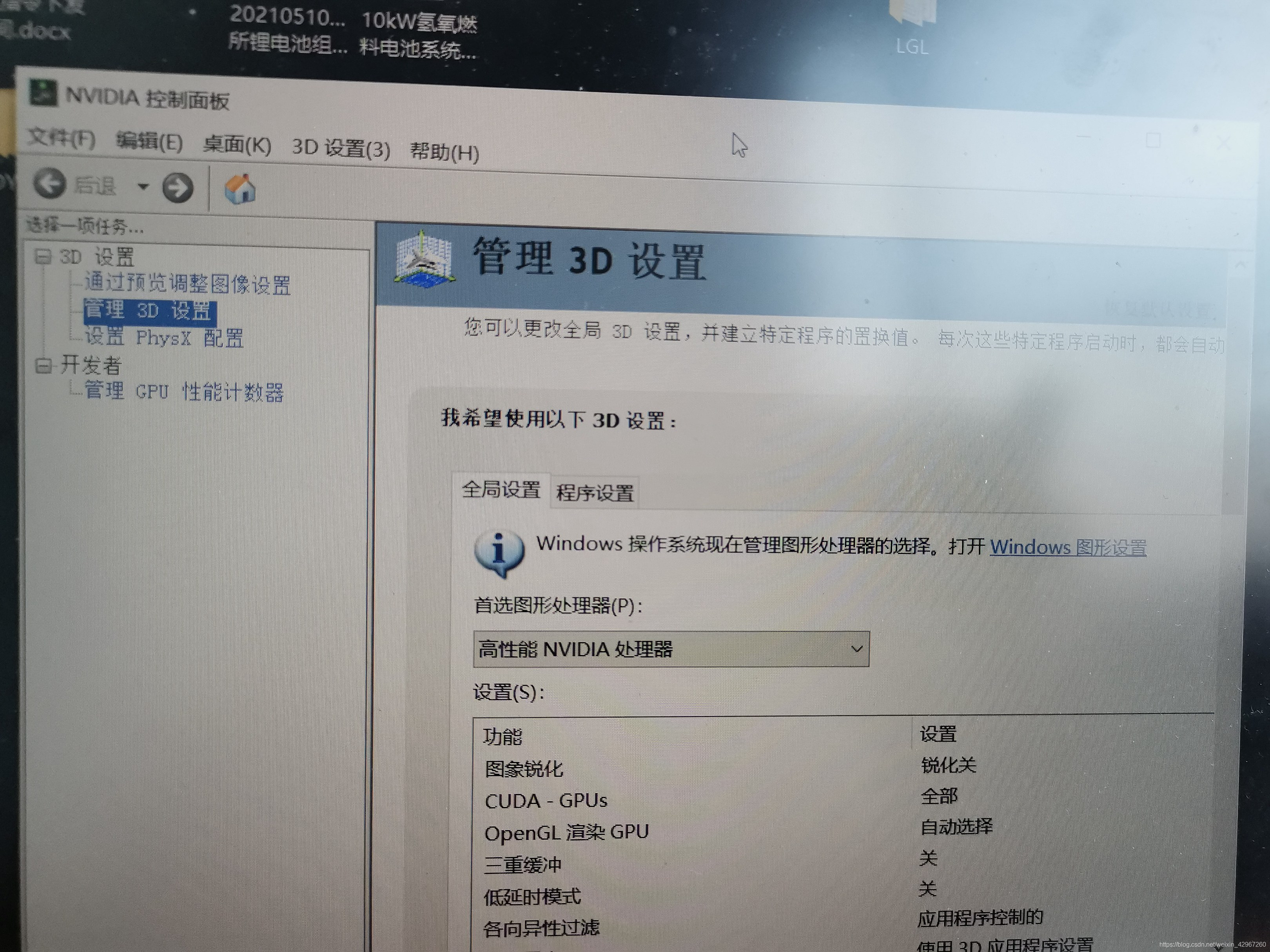 进入面板后,点击管理3D设置。将首选图形处理器(P):选为高性能NVIDIA处理器,然后再点击应用即可。